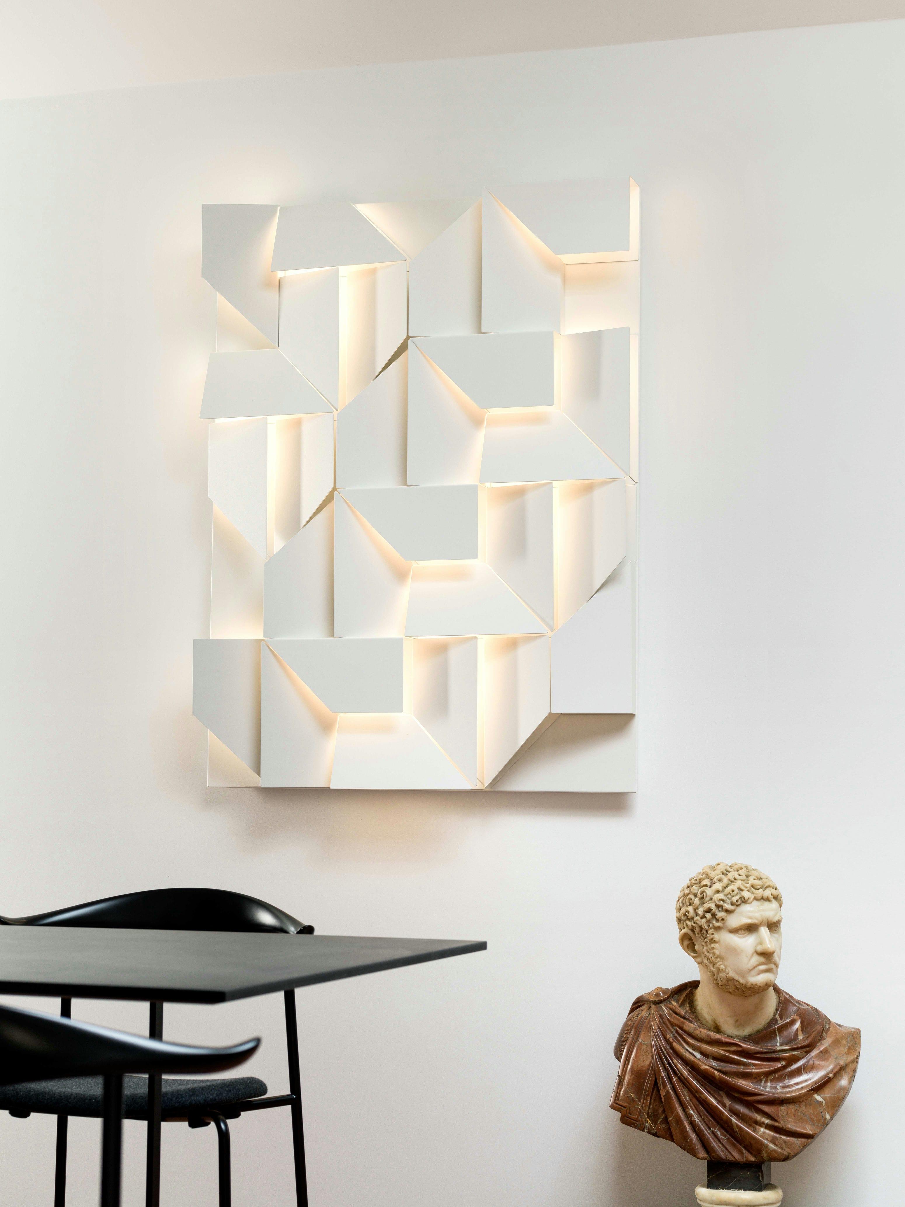 Nástěnná lampa Wall Shadows Grand, inspirovaná opakujícím se rytmem památek, jako je archeologické naleziště Baalbeck v Libanonu, nabízí neobvyklé scénáře osvětlení a rozptýlené LED světlo. Rozmazává hranici mezi industriálním designem a sochařským mistrovským dílem. Dostupná v různých velikostech, vyrobená z laserem řezaného a matně bílého lakovaného hliníku. Wall Shadows je jedinečné osvětlení, které dodává umělecký charakter každému interiéru.