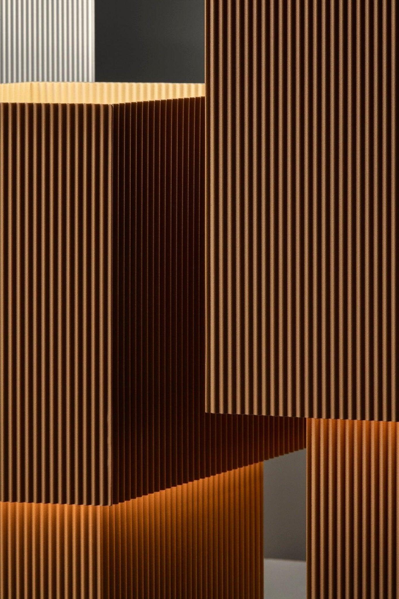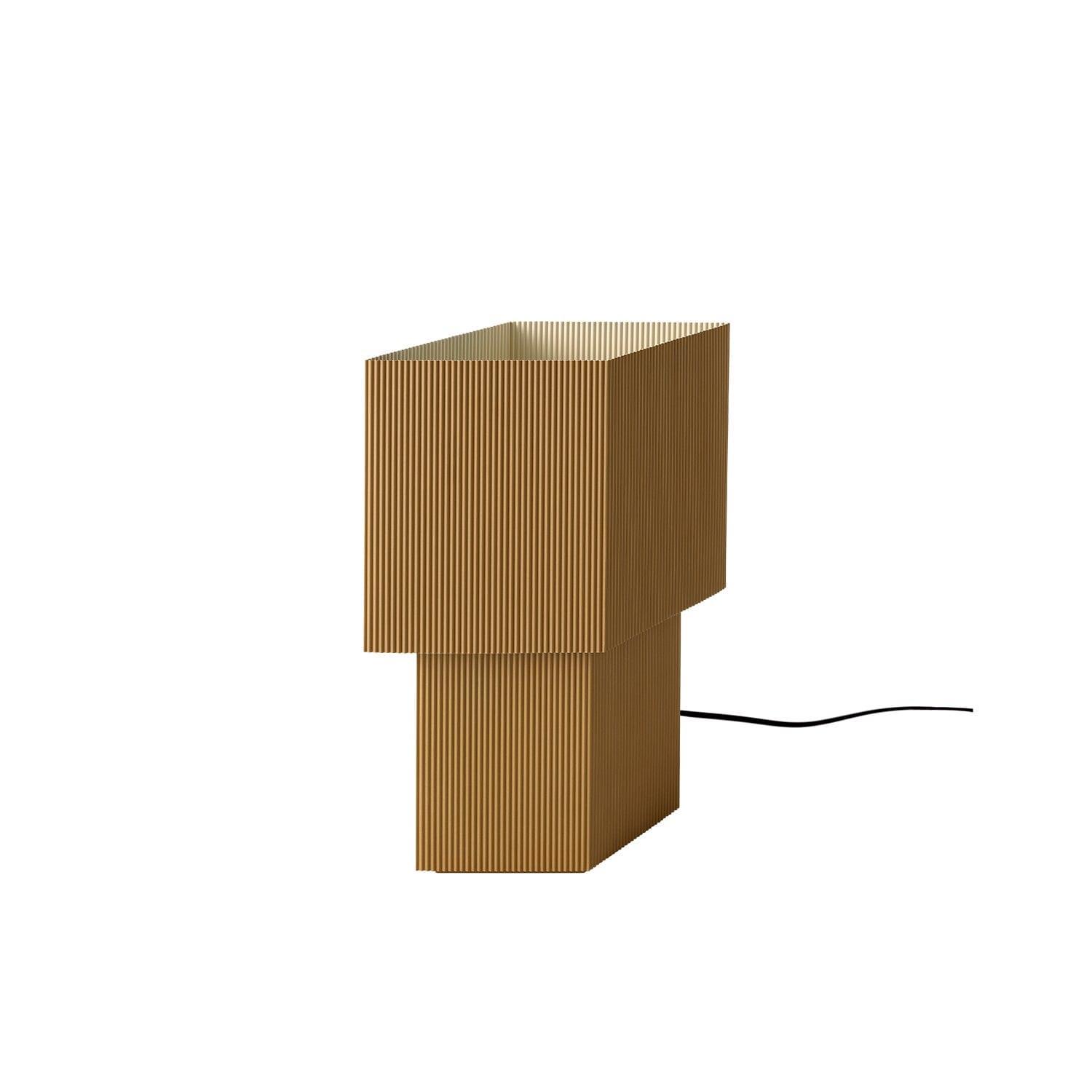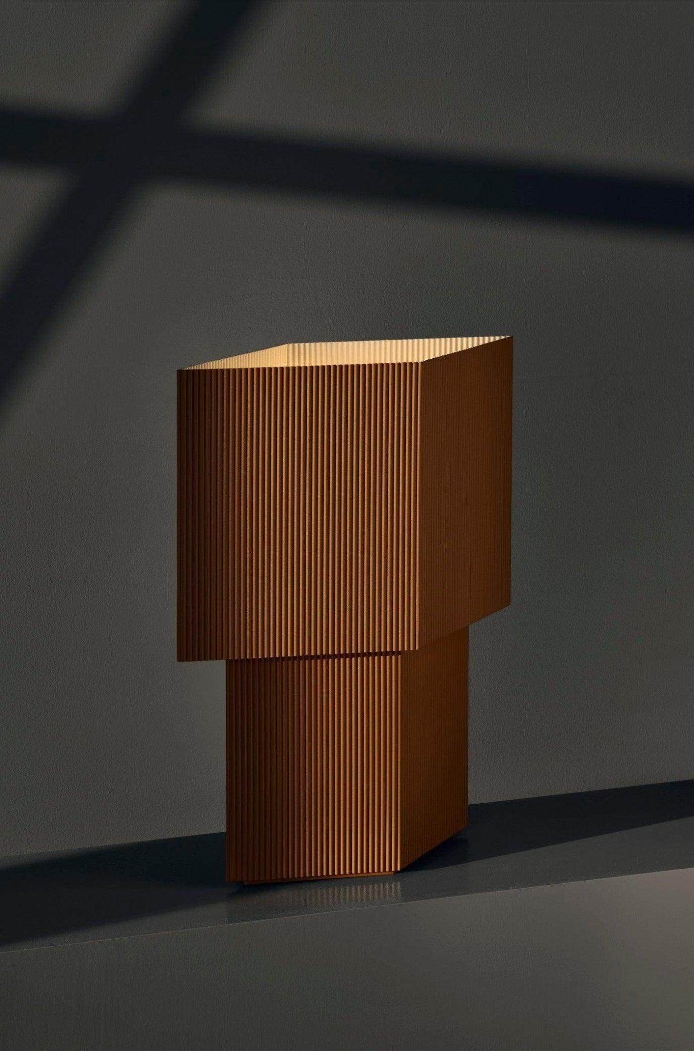 Stolní lampa Romb je příkladem promyšleného, sochařského designu, který přitahuje pozornost svou originální formou. Projekt je inspirován strukturou vlnité lepenky a charakteristická, geometrická silueta spočívá na dvou modulech umístěných jeden na druhém. Díky tomu lampa Romb působí lehce a moderně, zároveň vnáší do interiéru grafický akcent.