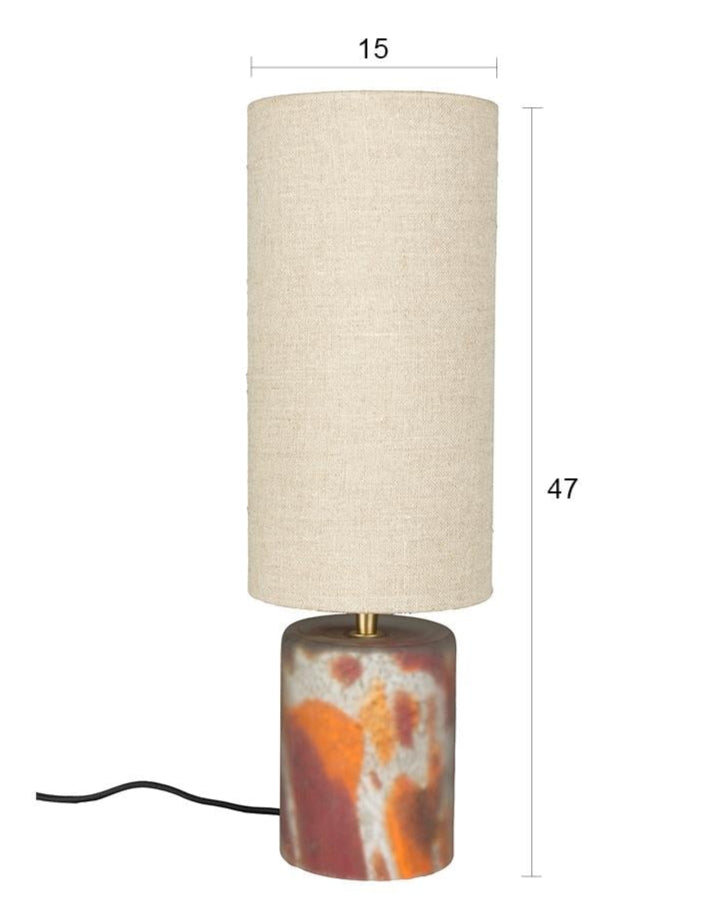 Moderní stolní lampa Earl je designový doplněk, který dokáže proměnit charakter interiéru a vnést do něj teplou, útulnou atmosféru. Její matné sklo zdobí barevný vzor v teplých tónech, připomínající akvarelové malby. Díky tomu lampa získává umělecký a poněkud excentrický charakter, ideálně navazující na atmosféru 70. let. Podlouhlý stínidlo z lehké, pletené tkaniny jemně rozptyluje světlo, vytvářející v místnosti náladový lesk.
