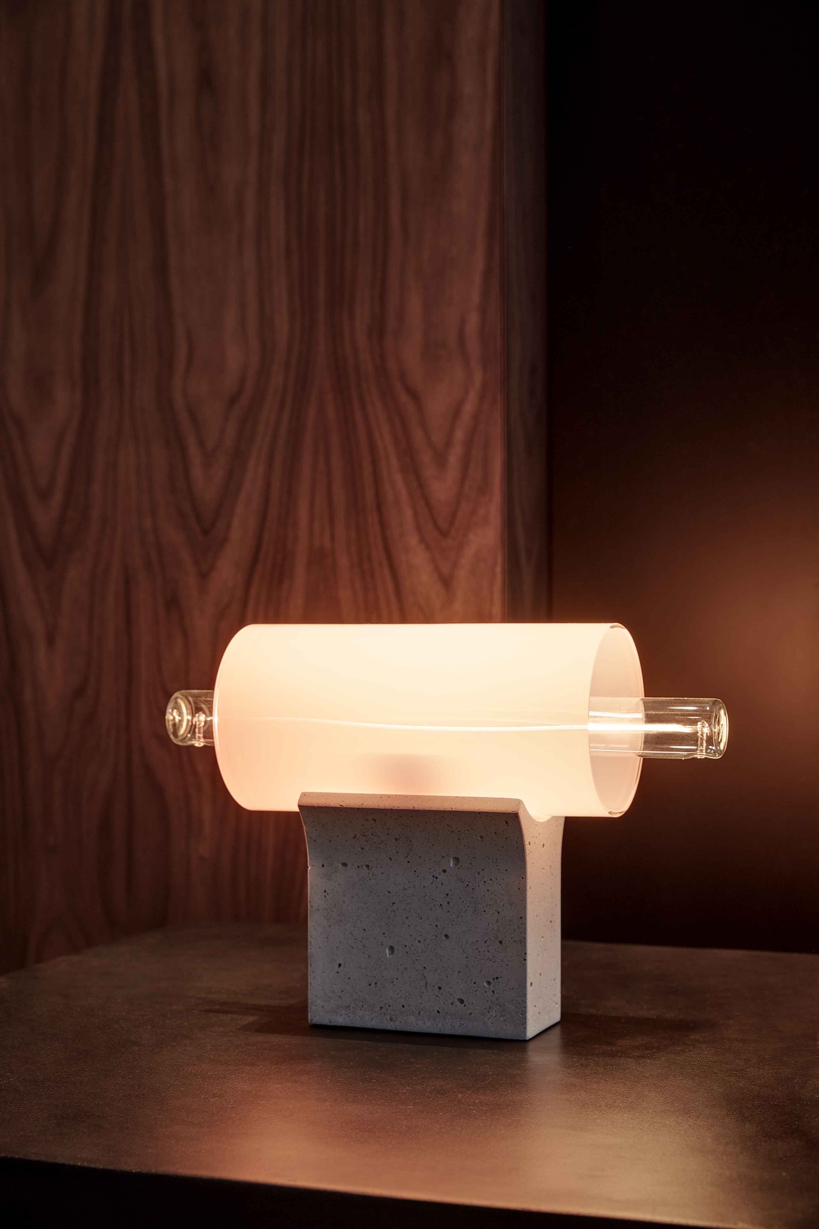 Charakterystycznymi elementami są dmuchane, przezroczyste szklane rurki, które łączą się z betonową oprawą z odłamkami recyklingowego szkła. Betonowa baza formowana jest w różne kształty, dostosowane do każdego rodzaju światła, co pozwala na tworzenie zarówno prostych, jak i złożonych kompozycji świetlnych. Środek betonowej oprawy zdobi delikatny rękaw z matowego lub przezroczystego szkła, przez który przebija światło, tworząc efekt, jakby świetlówka unosiła się wewnątrz. Lampa stołowa Overlay dodaje elegancji i artystycznego wyrazu do wnętrza, świetnie komponując się zarówno w domowych, jak i komercyjnych przestrzeniach.