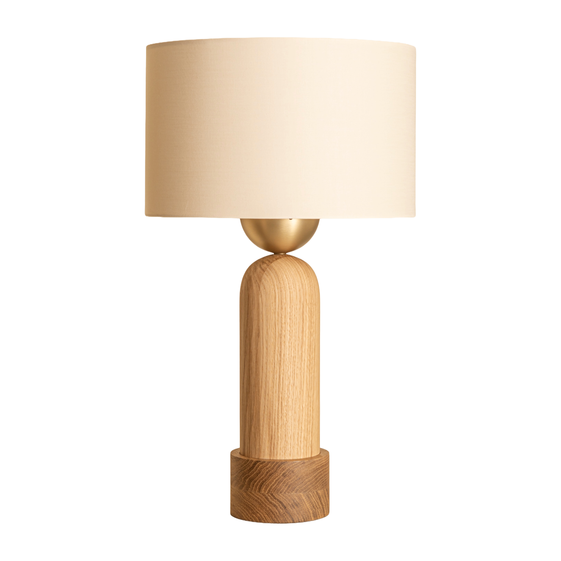 Stolní lampa Peona je příkladem nadčasového designu, který harmonicky spojuje kulaté tvary s elegantními materiály. Dřevěná základna kontrastuje s kovovou polokoulí z mosazi, a měkký bavlněný stínidlo jemně rozptyluje světlo, čímž vytváří útulnou atmosféru. Tato stolní lampa vnese do interiéru nádech moderní klasiky.