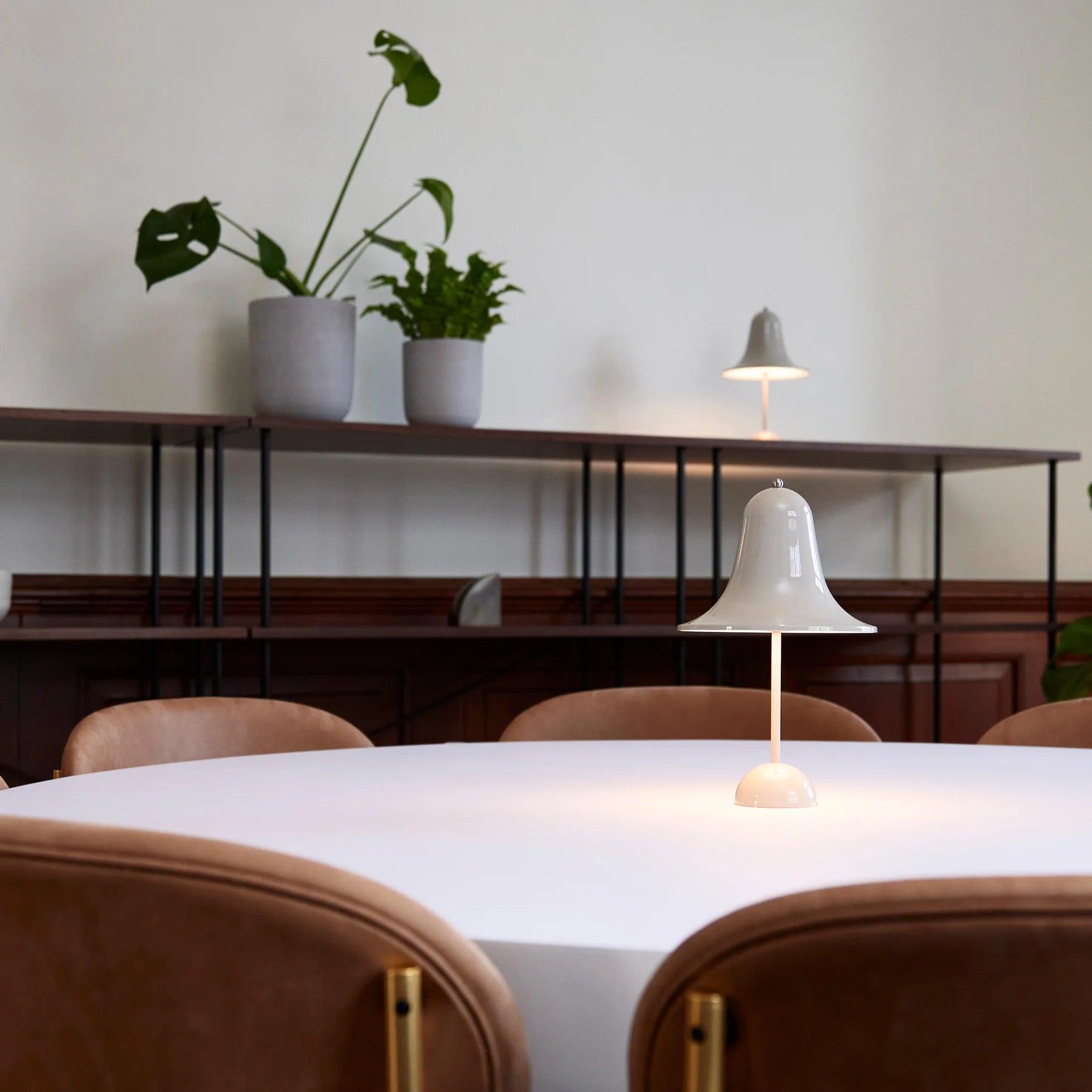 Linie Pantop je elegantní série lamp navržená Vernerem Pantonen v roce 1980, která dlouho tvořila základ kolekce značky Verpan. Přenosná stolní lampa Pantop je jedním z prvků této kolekce, charakterizovaná zvonkovým, široce rozšířeným stínidlem, které je montováno otvorem dolů.