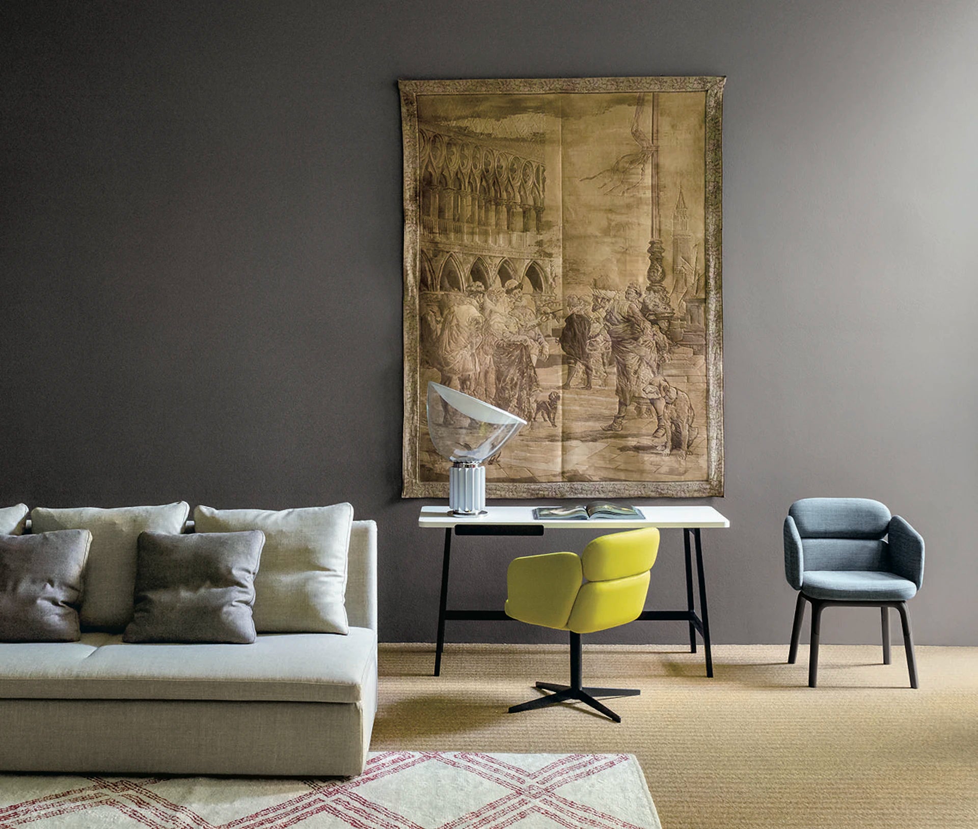 Vznikla z experimentálního nápadu „obrácení“ stropní lampy, Taccia se rychle stala ikonou italského designu 60. let. Díky své jedinečné siluetě a vysoké kvalitě zpracování, tato lampa již léta okouzluje milovníky dobrého designu. Skvěle se hodí jak do klasických, tak do moderních aranžmá, plníc nejen funkci užitkovou, ale také dekorativní.