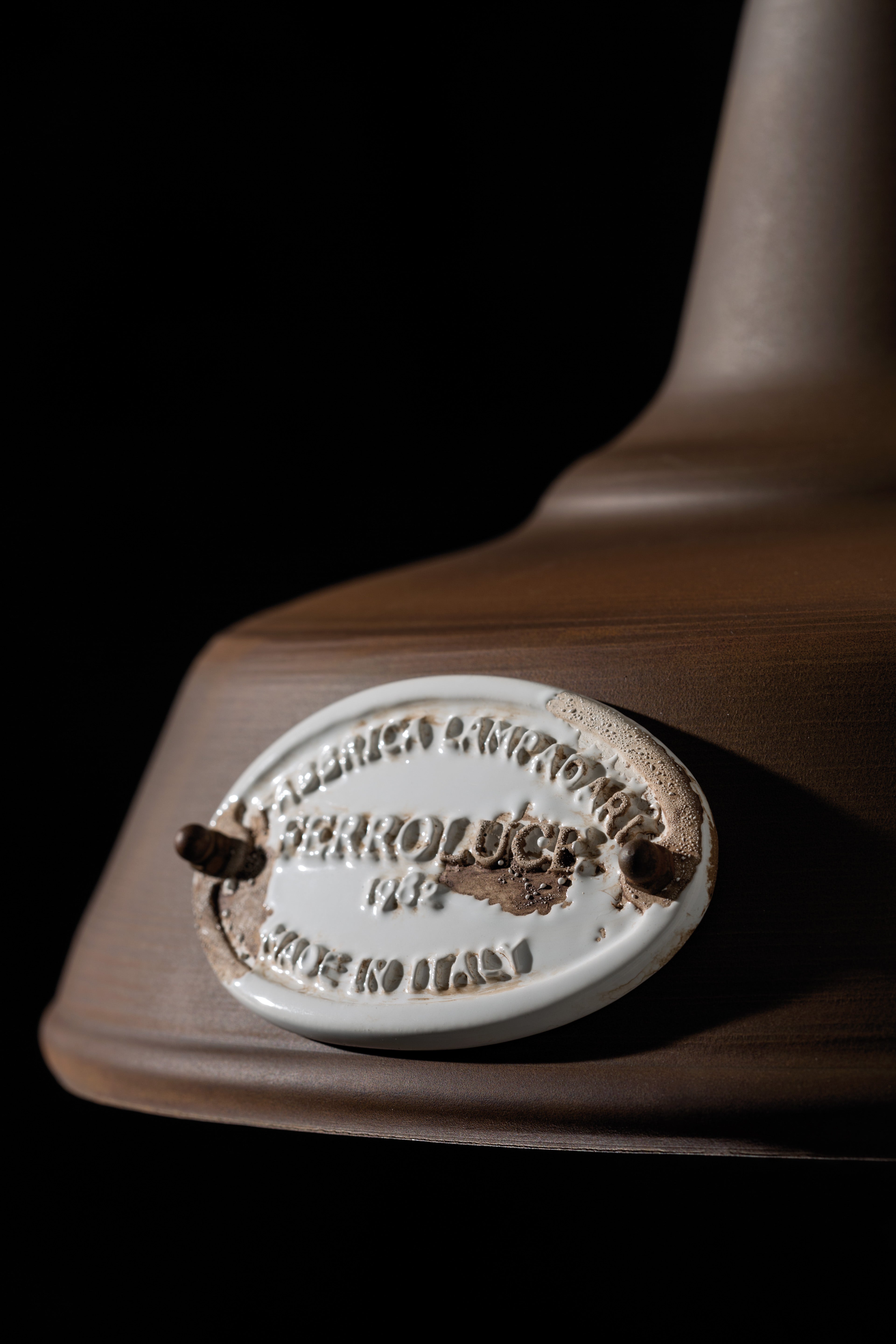 Prosta forma klosza przełamana została dekoracyjnym emblematem „Made in Italy”, a ceramiczne detale z przetarciami opowiadają historię materiału – jakby z biegiem lat nabrały szlachetności. Lampa emituje czyste światło, dzięki czemu idealnie wpasowuje się w klimat funkcjonalnej kuchni, jadalni czy przytulnego salonu.