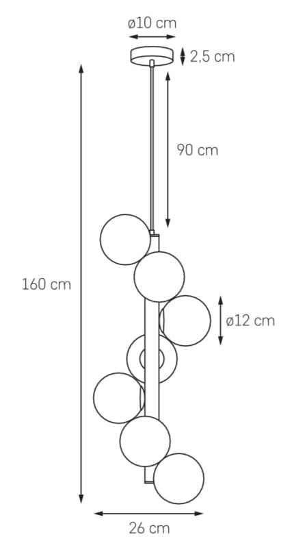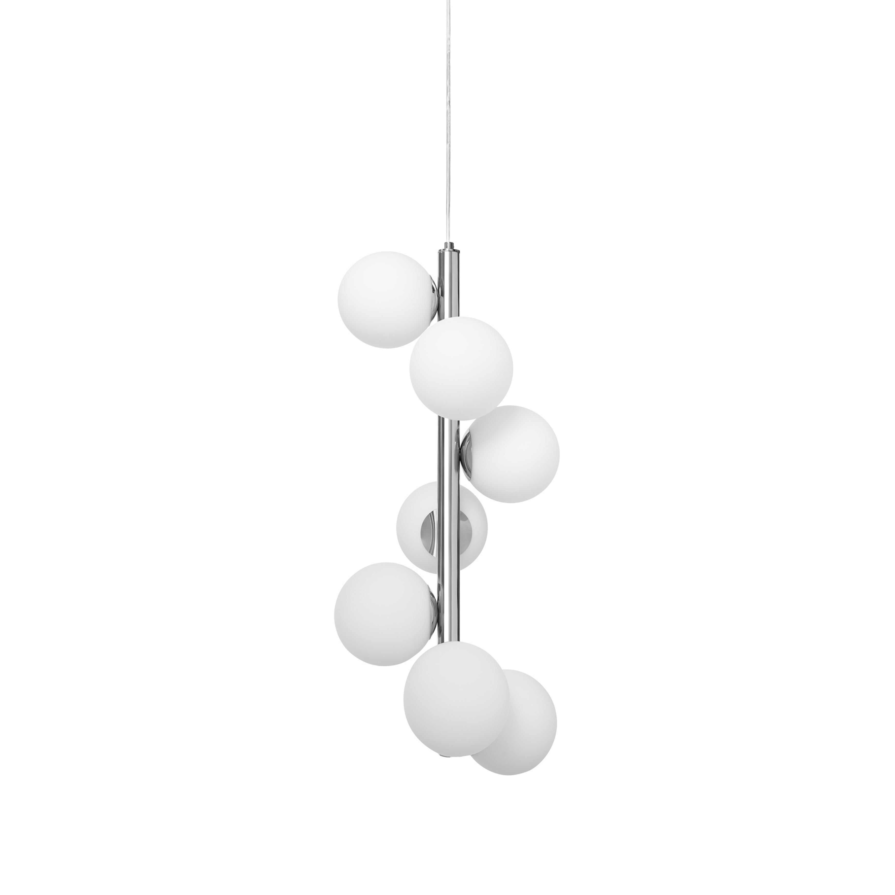 Elegancka lampa wisząca Cumulus Vertical to projekt, który zachwyca subtelną formą i nowoczesnym wykończeniem. Siedem kulistych kloszy z mlecznego szkła ułożonych wokół pionowego stelaża tworzy efekt świetlistego grona, przypominającego zawieszone w powietrzu obłoki. Wykończenie w kolorze błyszczącego chromu podkreśla nowoczesny, ponadczasowy charakter oprawy, dodając jej szlachetnego chłodu i elegancji.