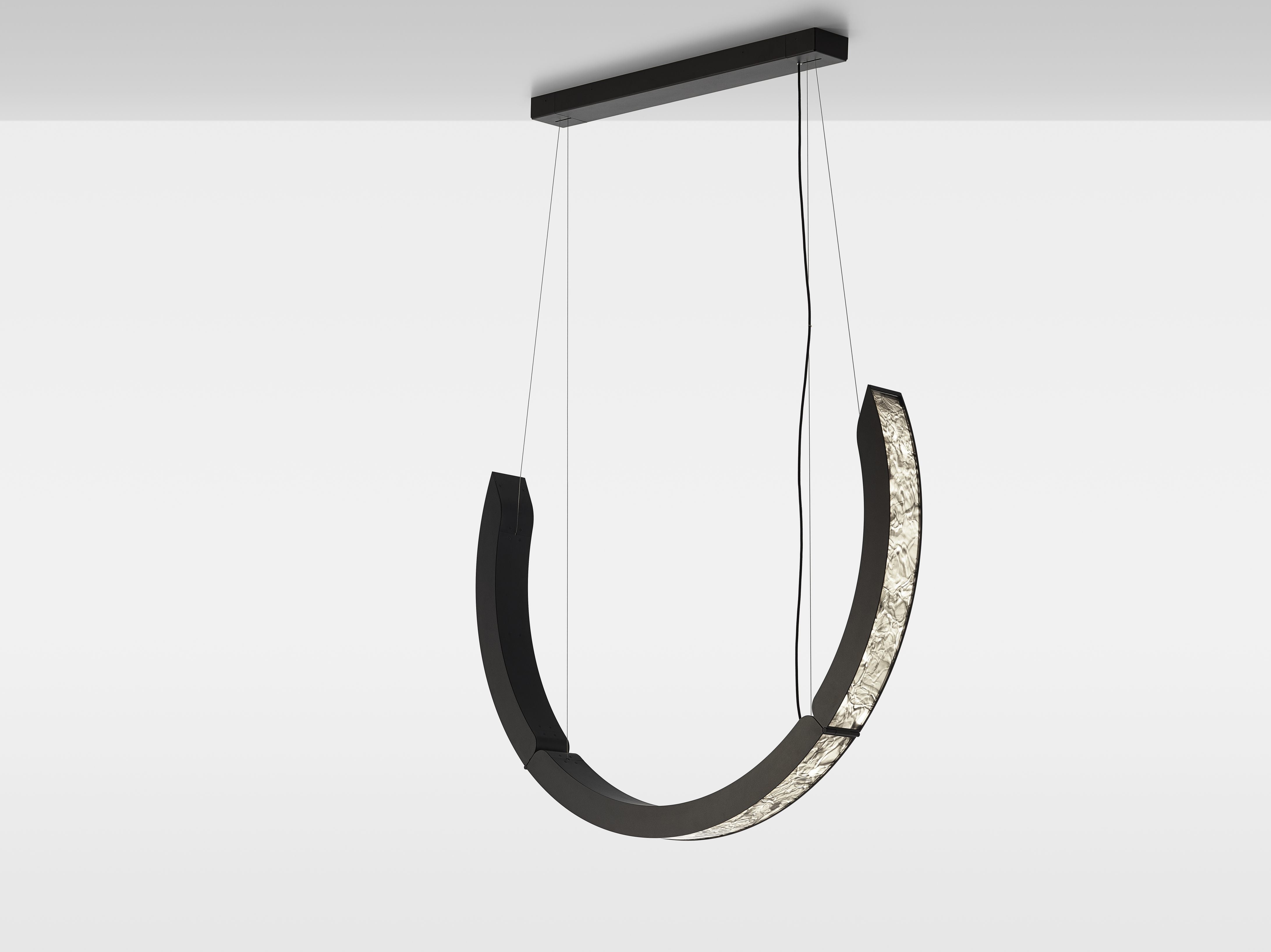 Závěsné svítidlo Elo spojuje pokročilou sklářskou techniku fusing s elegantními hliníkovými rámy, vytvářejícími tři kloubové oblouky, které lze regulovat pro různé scénické efekty. Název „Elo“ odkazuje na její schopnost vytvářet rozmanité konfigurace, které mohou dominovat a formovat prostor.