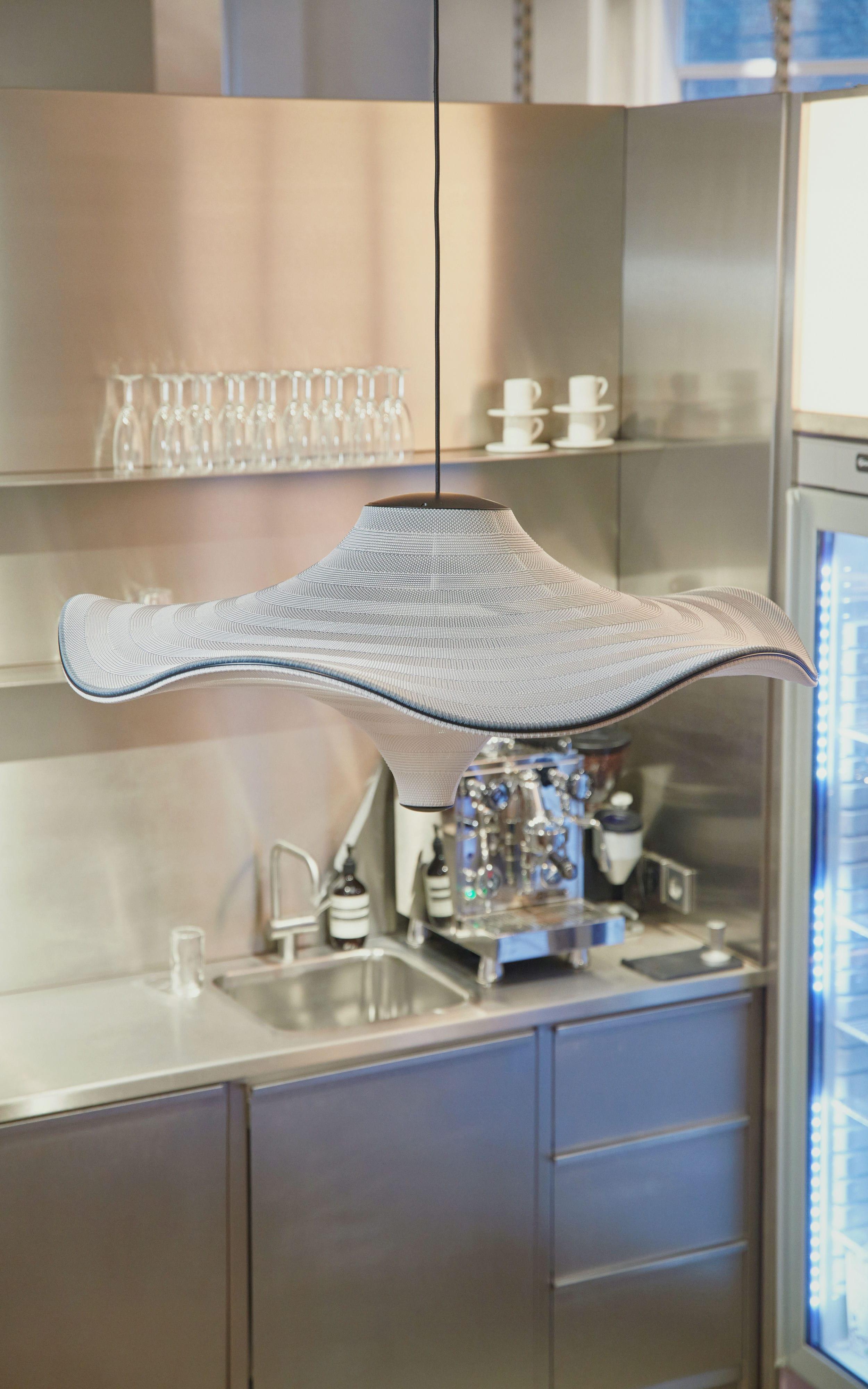 Flying to závěsná lampa o jemném, organickém tvaru. Po zavěšení vypadá, jako by se lehce vznášela ve vzduchu. Její jedinečný tvar vzniká díky napnutí trojrozměrné pleteniny mezi vlnitou hliníkovou rámem a centrálním prvkem, který odděluje horní a dolní část lampy.