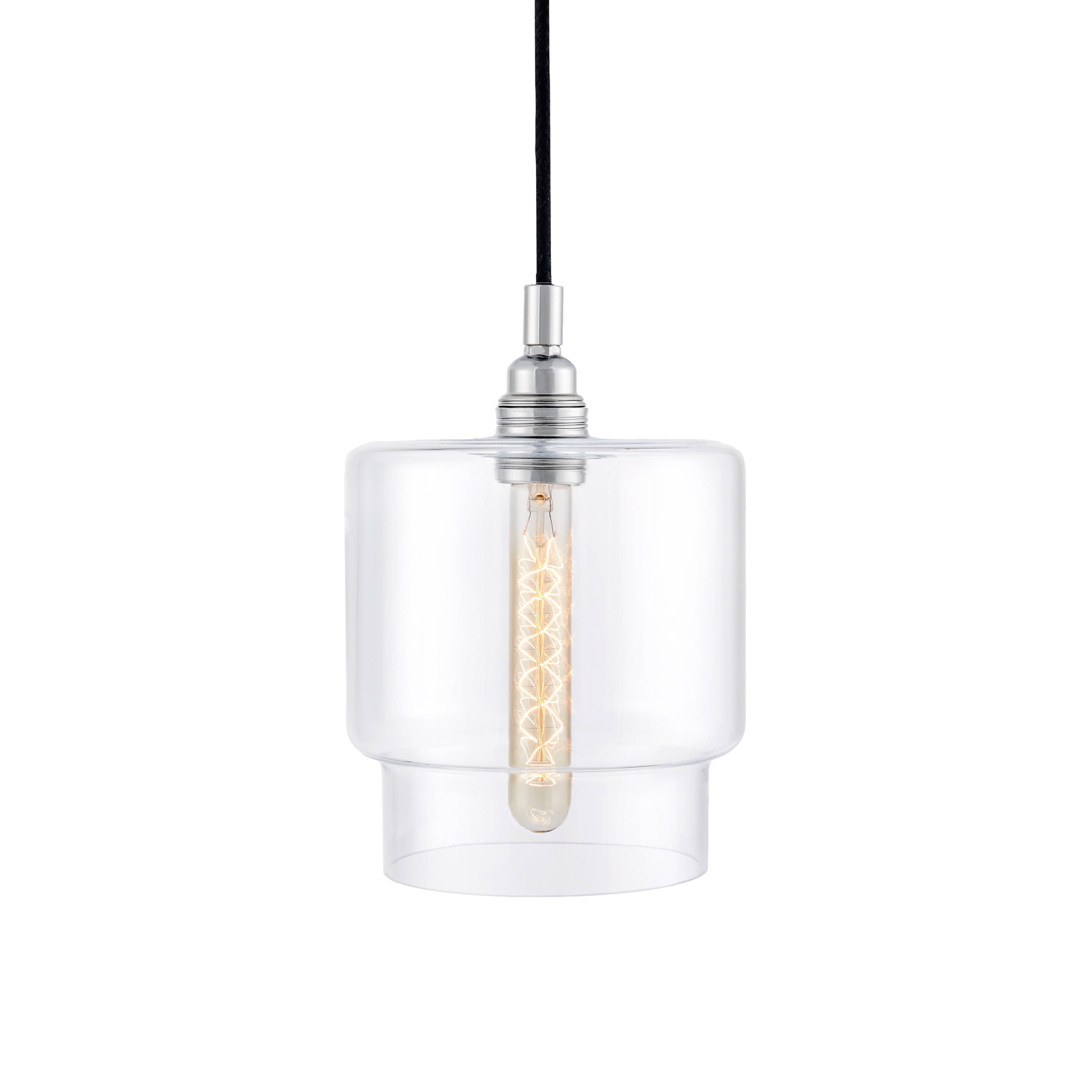 Závěsné svítidlo Longis IV je stylovou kombinací lásky k skleněným formám a surového charakteru industriálních inspirací. Její průhledný stínidlo, vyrobené z foukaného skla, přitahuje pozornost svým elegantním, mírně kuželovitým tvarem, který se jemně zužuje směrem nahoru. Chromované detaily – stylizovaný držák žárovky a stropní kryt – dodávají eleganci, zatímco černý textilní kabel dokonale doplňuje celek a vytváří soudržnou a rafinovanou kompozici. Toto moderní závěsné svítidlo se snadno uplatní jak v industriálních, tak v moderních, minimalistických interiérech.