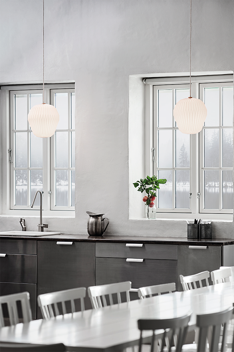Svítidlo je k dispozici jako jednotlivé zavěšení, ale také jako lustr se třemi, pěti nebo sedmi stínidly. To je vynikající volba pro ty, kteří hledají elegantní, ale subtilní osvětlení, které přinese do interiéru harmonii a teplo.