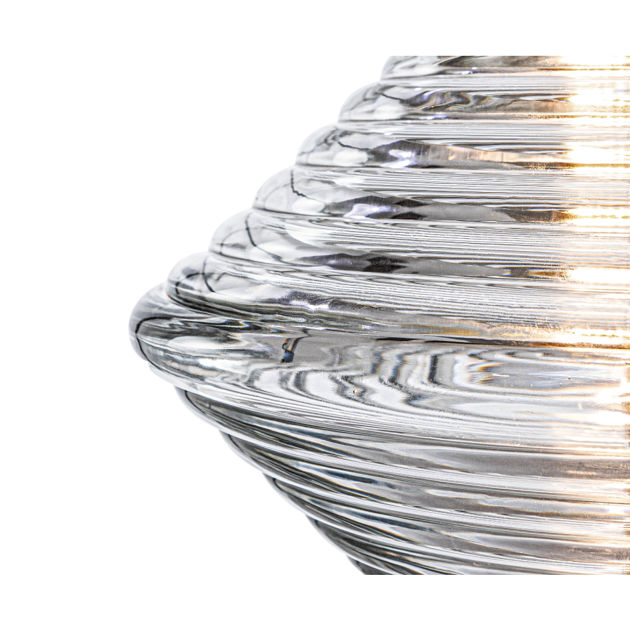 Závěsná lampa Press je jedinečným příkladem mistrovství průmyslového designu, navržená s ohledem na trvanlivost a estetiku. Vyrobena z tlustého, průhledného lisovaného skla, lampa uchvacuje pevnou konstrukcí a výraznými rýhami, které efektně lámou a rozptylují světlo. Díky své masivní formě a průhlednosti materiálu lampa nejen osvětluje prostor, ale také se stává působivým dekorativním prvkem.