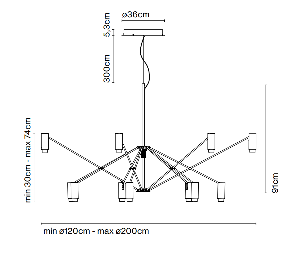 Rozłóż lub złóż światło dzięki najnowszemu projektowi PerezOchando – elastycznej, wielkoformatowej lampie do dużych przestrzeni. Główna struktura to duży, czarny trzon z wykończeniem w kolorze złotym, z którego wychodzą pręty z reflektorami. Pręty można przesuwać, aby rozszerzać lub skupiać światło. Reflektory z pierścieniami w kolorze kości słoniowej, terakoty lub złota równomiernie rozpraszają światło.