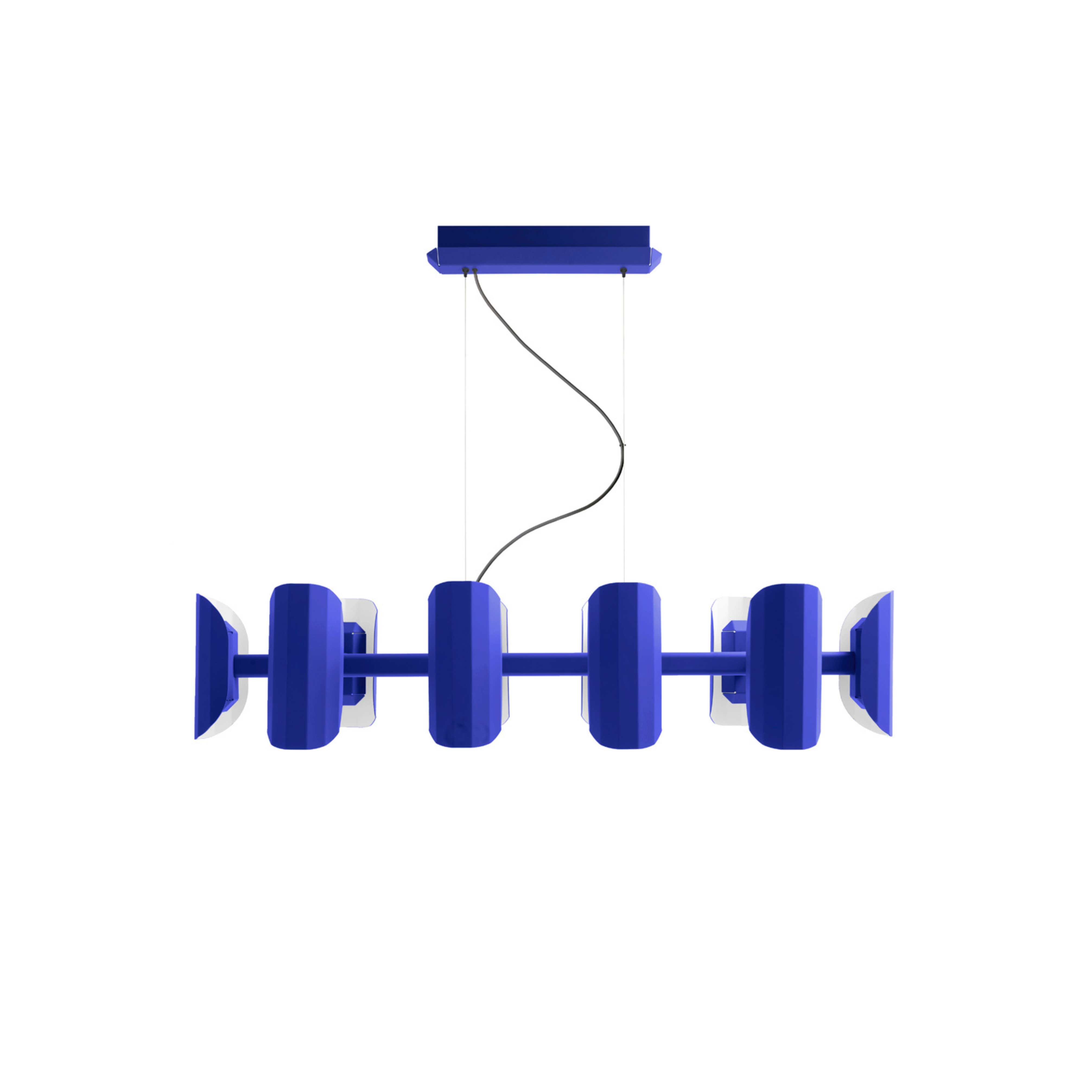 Lustr na více ramen od Grynasz Studio v barvě hlubokého kobaltu je výrazná, industriální forma inspirovaná designem polských kovovýrobních závodů z 50. až 70. let 20. století. Desetiramenná konstrukce o rozměrech 120 x 40 x 25 cm byla vyrobena z lakované práškové nerezové oceli, a každá z fasetových stínidel byla navržena tak, aby jemně odrážela a rozptylovala světlo.
