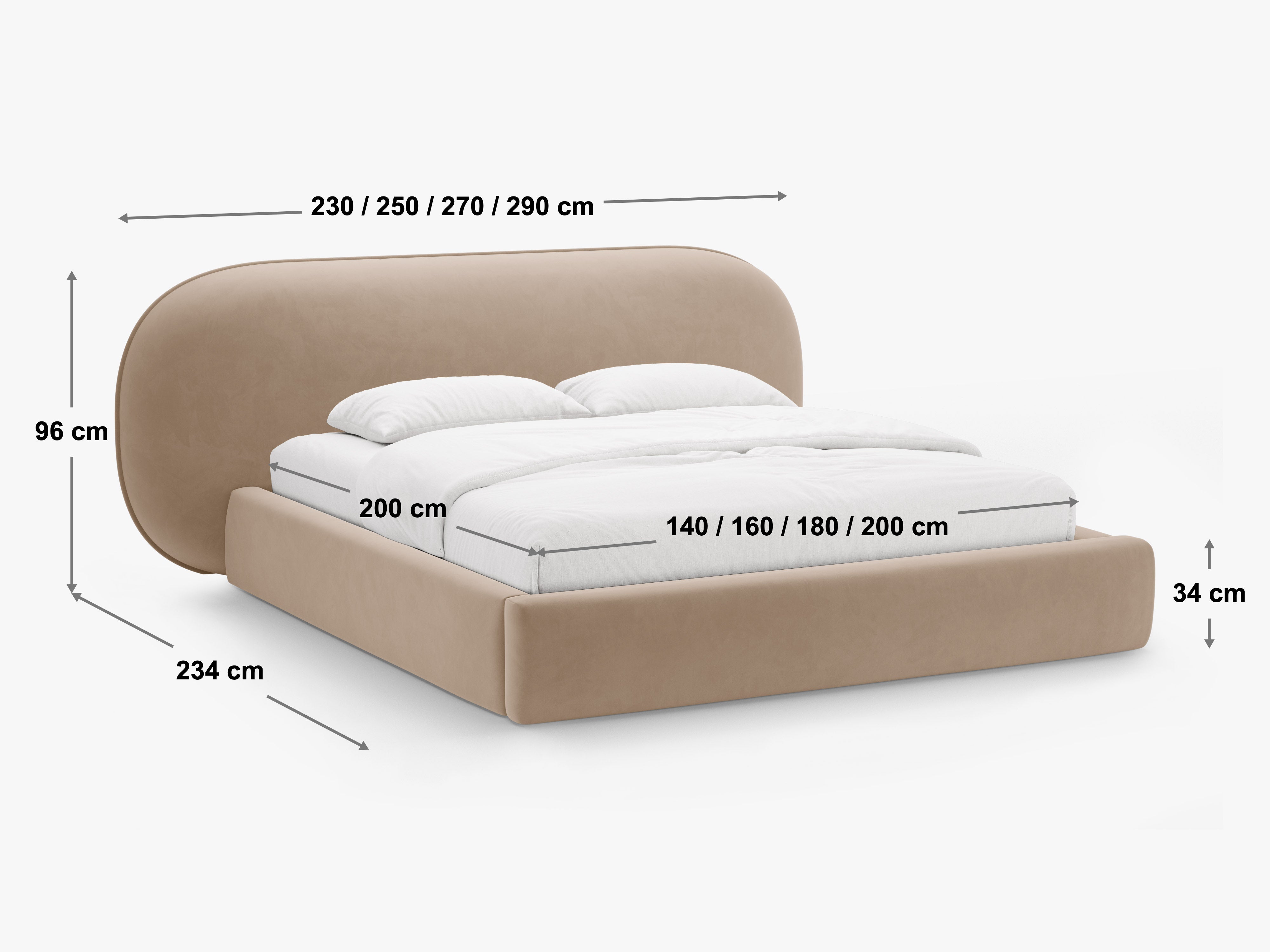 Postel Ovalo se vyznačuje měkkým, zaobleným tvarem, který do ložnice vnáší klid a útulnou atmosféru. Jemné linie a plné tvary činí čalouněnou postel do ložnice harmonickým prvkem interiéru, který se dokonale hodí do moderních aranžmá. Zaoblené, masivní čelo objímá a poskytuje pohodlnou oporu během každodenního odpočinku, čímž vytváří komfortní prostor pro relaxaci.