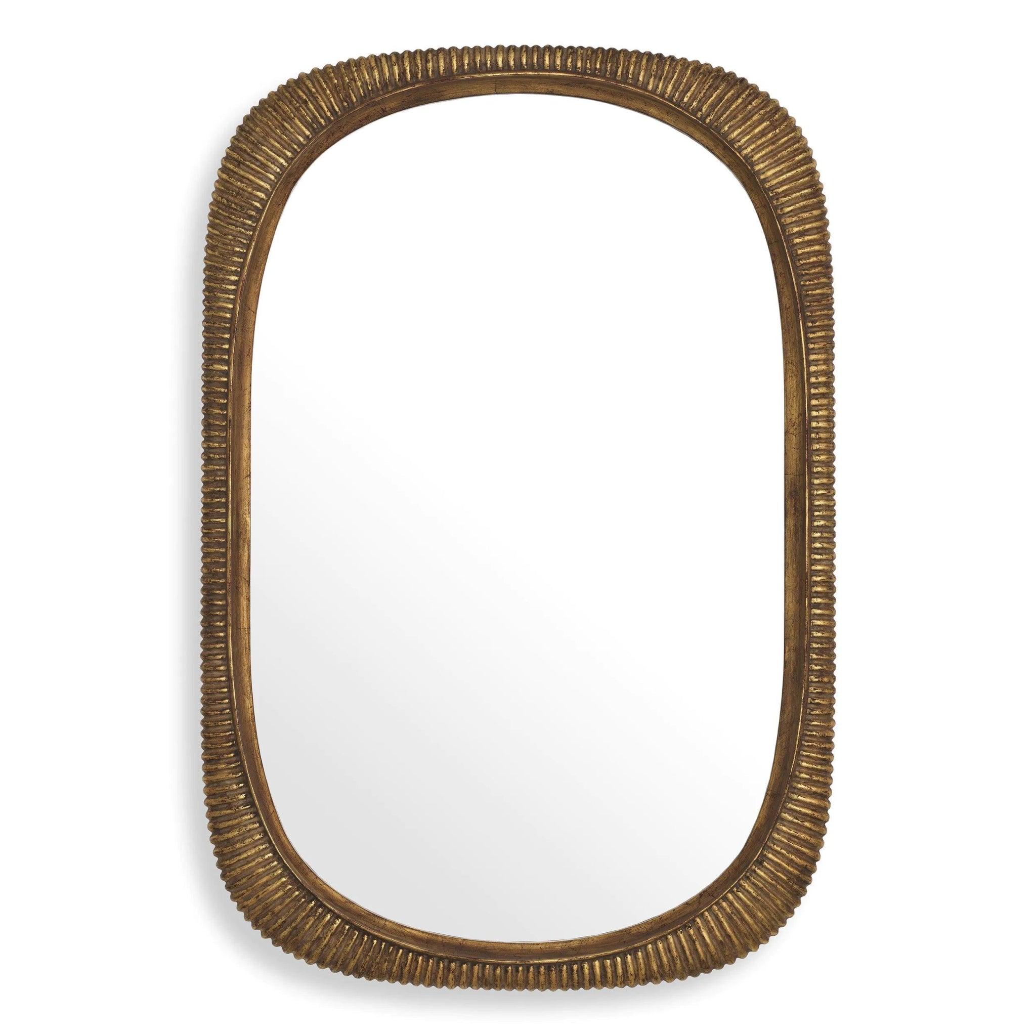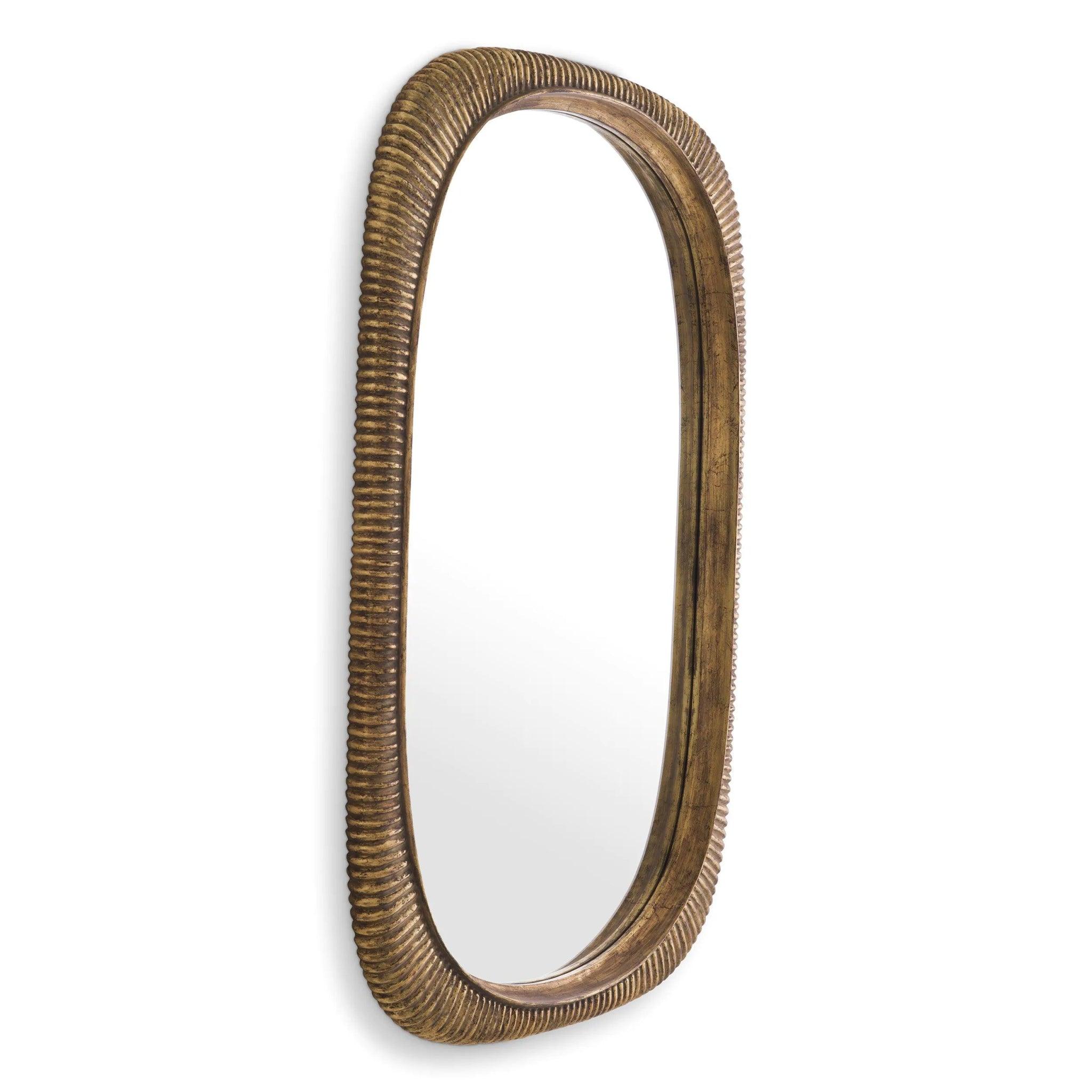 Pruhovaná rám zrcadla Casimir je zručně ručně vyřezávaný z mahagonového dřeva a dokončený v barvě antického zlata. Vnější strana rámu je obdélníková s zaoblenými rohy, zatímco vnitřní má oválný tvar. Díky charakteristickému designu toto nádherné akcentující zrcadlo vnese do vašeho interiéru kousek boho stylu.