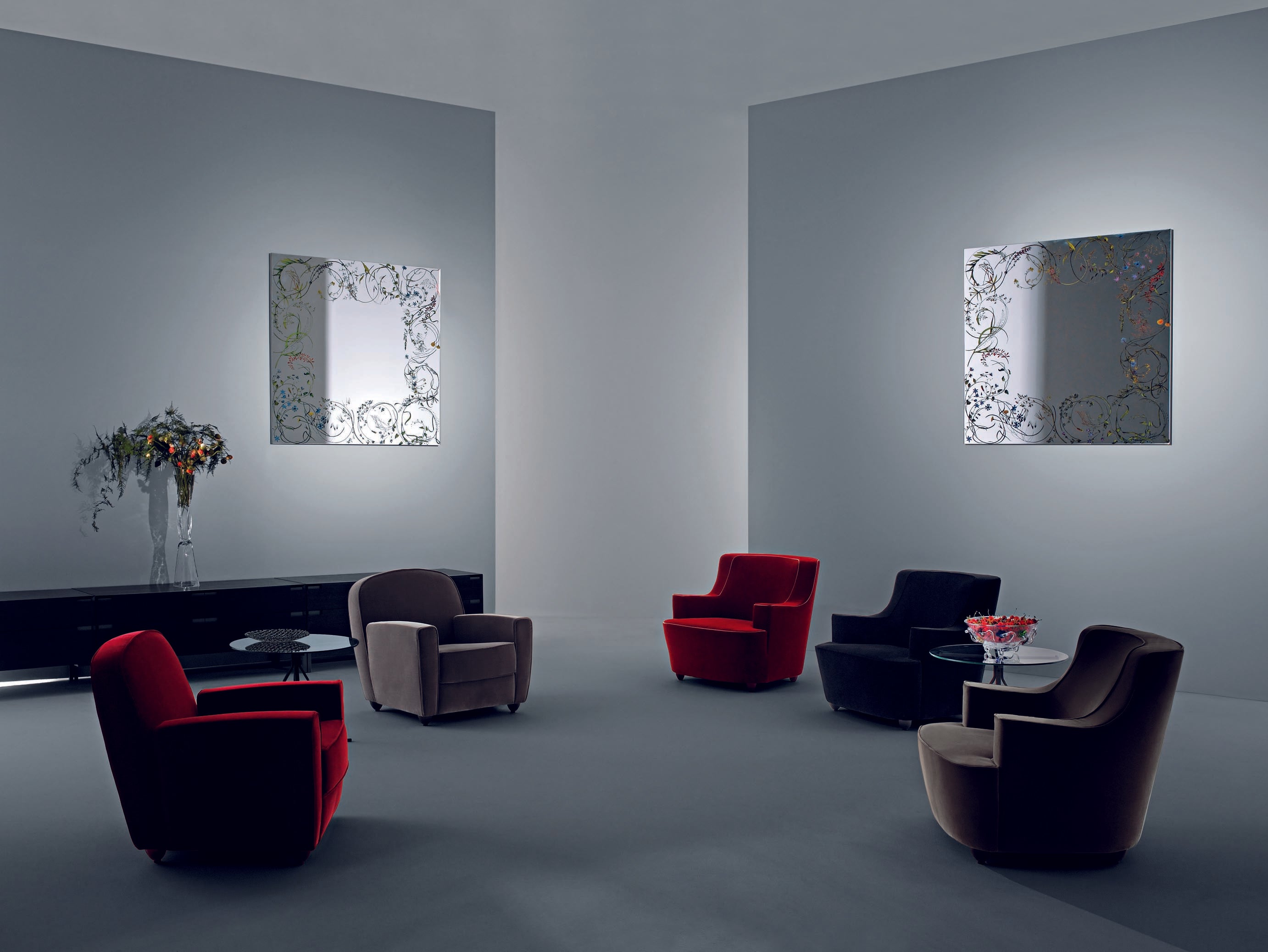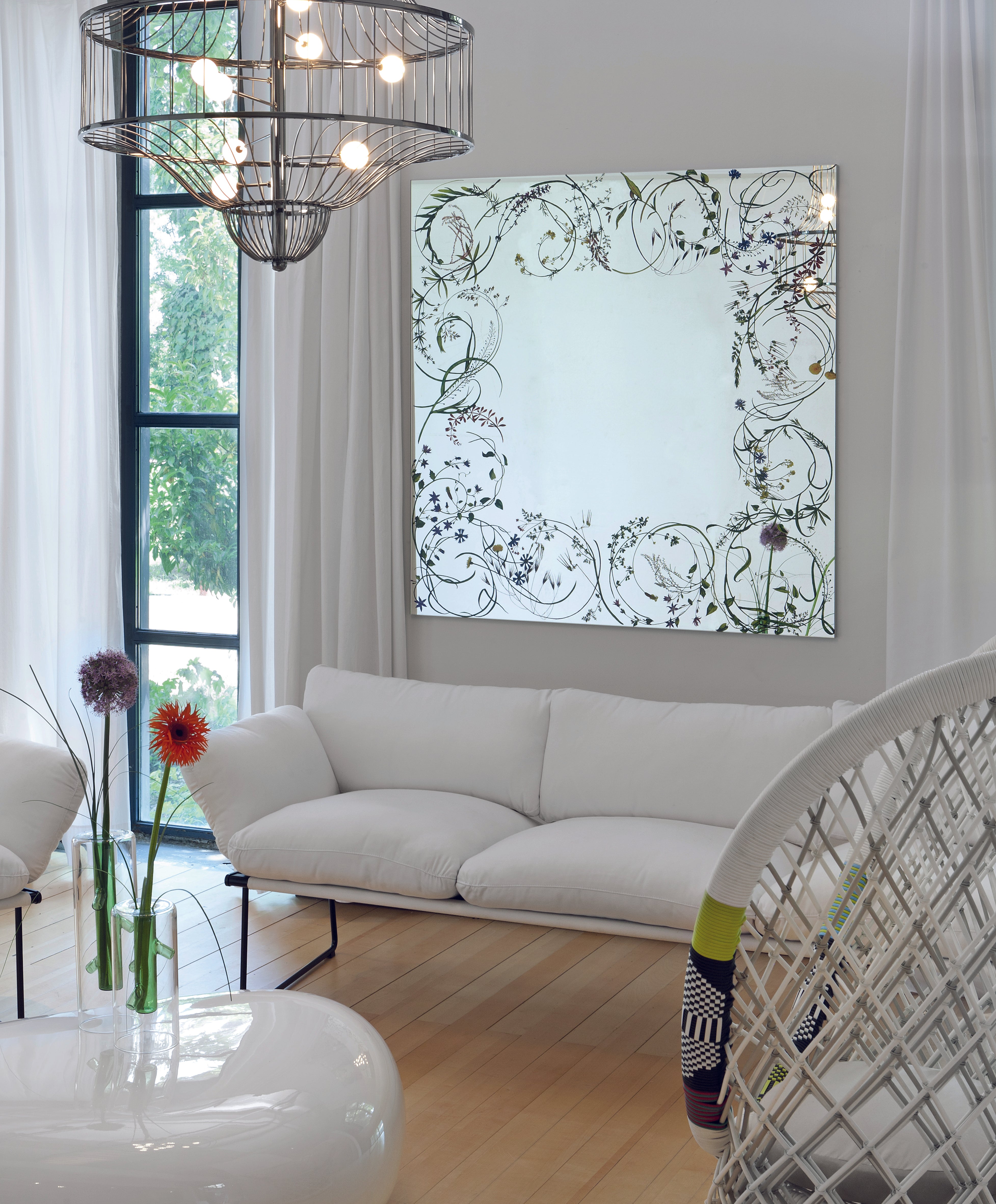 Zrcadlo Egeso je jedinečný dekorativní prvek, který spojuje užitnou funkci s jemným uměleckým výrazem. Navržené Vittoriem Locatellim, přitahuje pozornost delikátním potiskem zobrazujícím motiv divokých bylin, který dodává celku lehkost a poetické kouzlo.