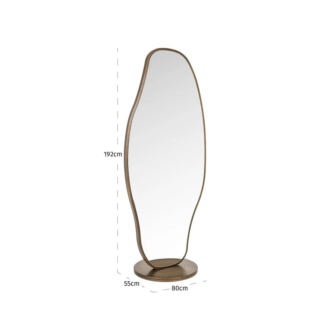 Designerské zrcadlo Jalyce s organickým tvarem je výjimečný prvek vybavení interiéru, který spojuje funkčnost s moderní estetikou. Rám v barvě kartáčovaného zlata dodává eleganci a luxusní charakter, a netypická linie zrcadla přitahuje pozornost, vytvářející efektní dekoraci. Díky velkým rozměrům zrcadlo se hodí do obývacího pokoje, šatny nebo předsíně, opticky zvětšuje prostor a dodává mu jedinečný styl.