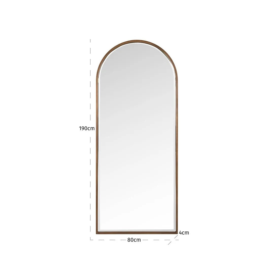 Pevný rám z železa v odstínu kartáčovaného zlata harmonicky ladí s bezpečným sklem, což zajišťuje trvanlivost a bezpečnost používání. Zrcadlo o výšce 190 cm umožňuje kompletní přehled postavy a zároveň představuje dekorativní prvek, který se skvěle hodí jak do moderních, tak do klasických aranžmá.