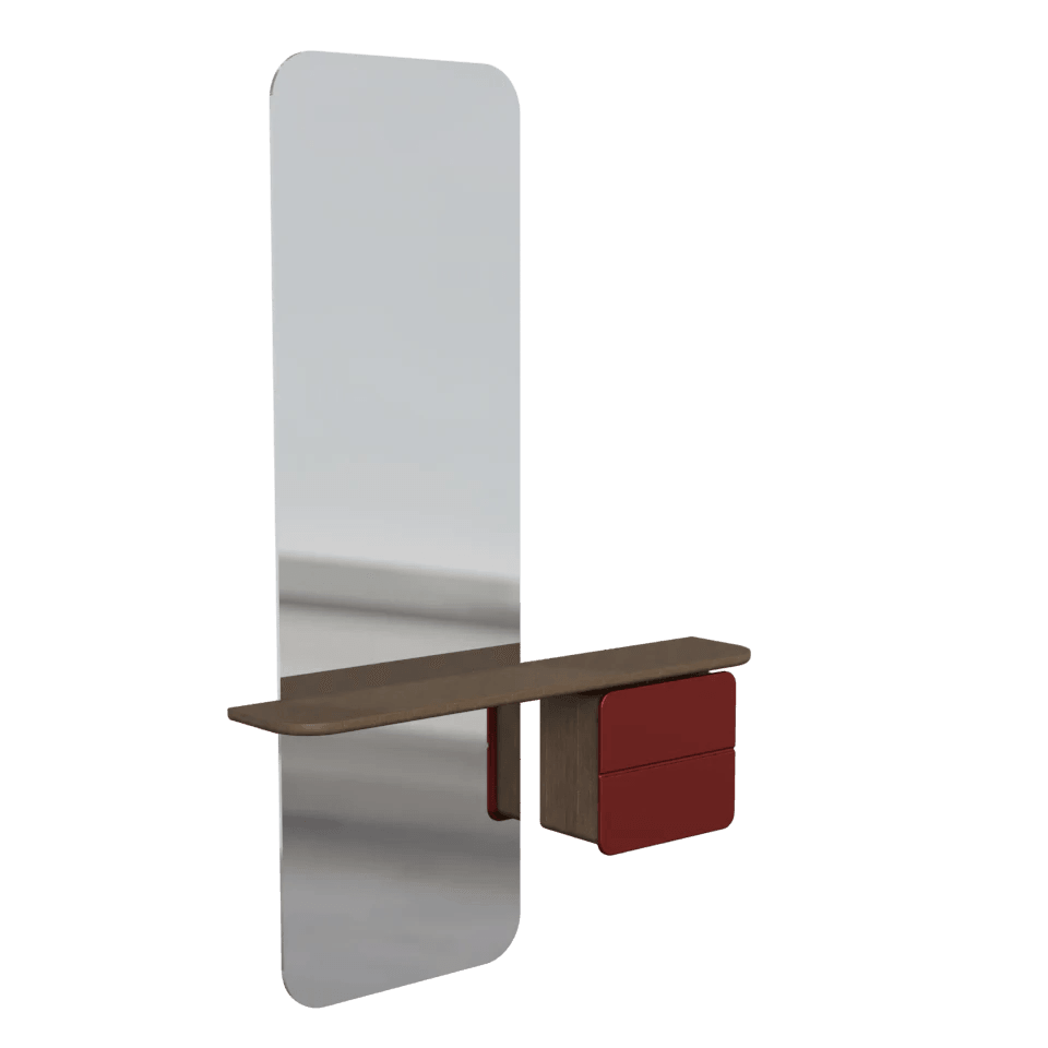 Díky správné výšce zrcadlo poskytuje odraz po celé své délce, což umožňuje dokonalou přípravu před odchodem z domova. Navíc je zrcadlo vybaveno policí a malou skříňkou s praktickým zrcátkem a koženým podnosem – ideální řešení pro ukládání každodenních předmětů, jako jsou klíče, kosmetika, sluneční brýle nebo náhradní mince.