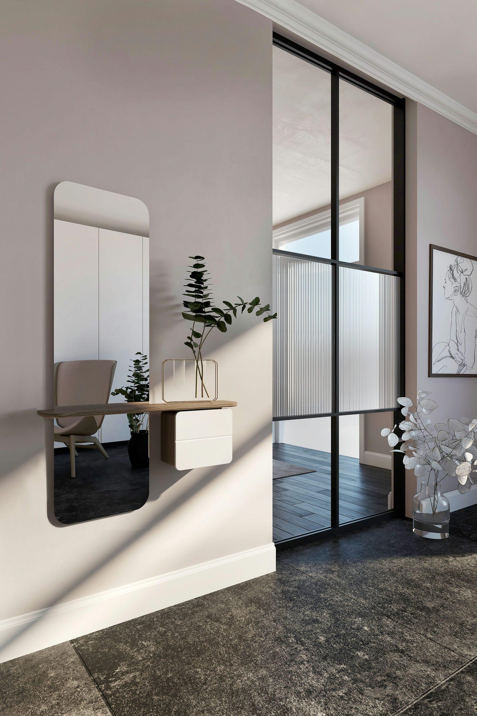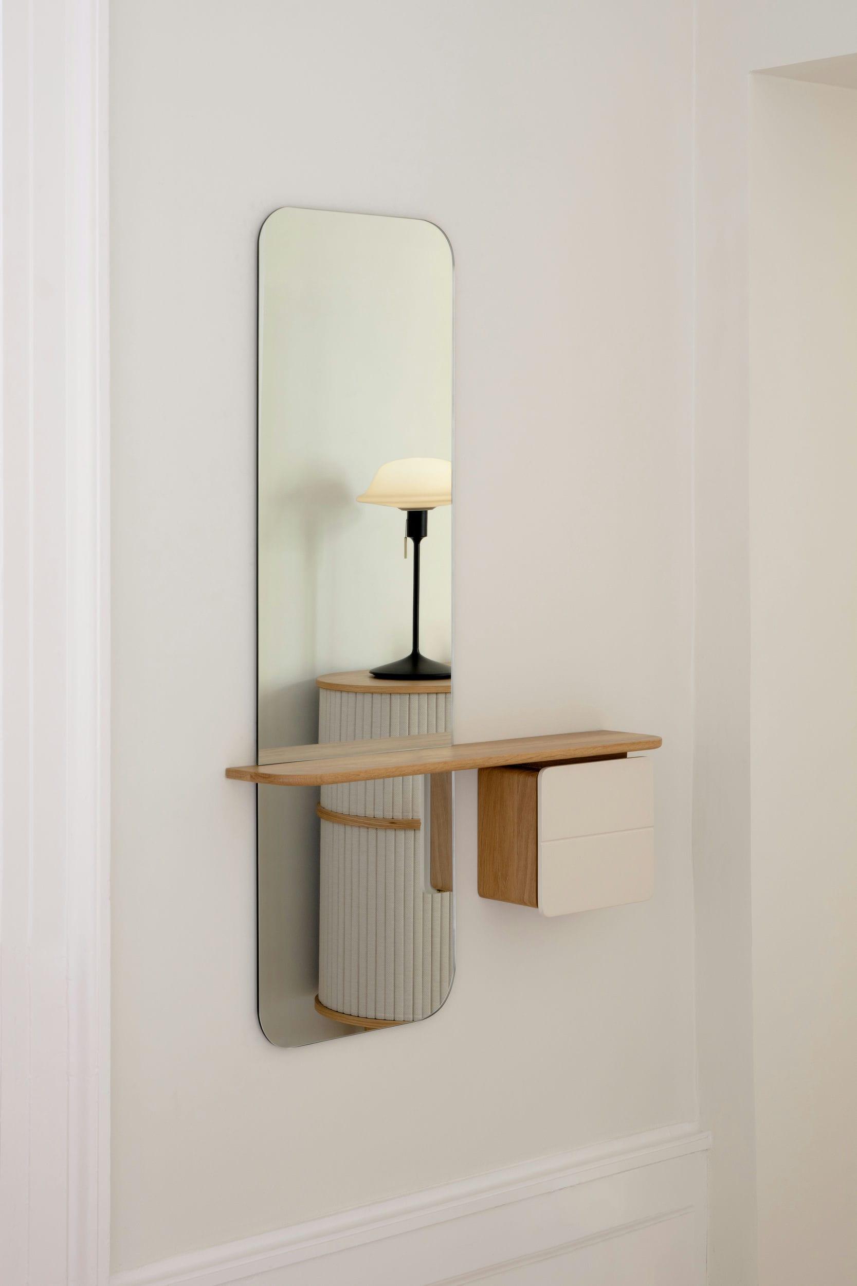 Díky správné výšce zrcadlo poskytuje odraz po celé své délce, což umožňuje dokonalou přípravu před odchodem z domova. Navíc je zrcadlo vybaveno policí a malou skříňkou s praktickým zrcátkem a koženým podnosem – ideální řešení pro ukládání každodenních předmětů, jako jsou klíče, kosmetika, sluneční brýle nebo náhradní mince.