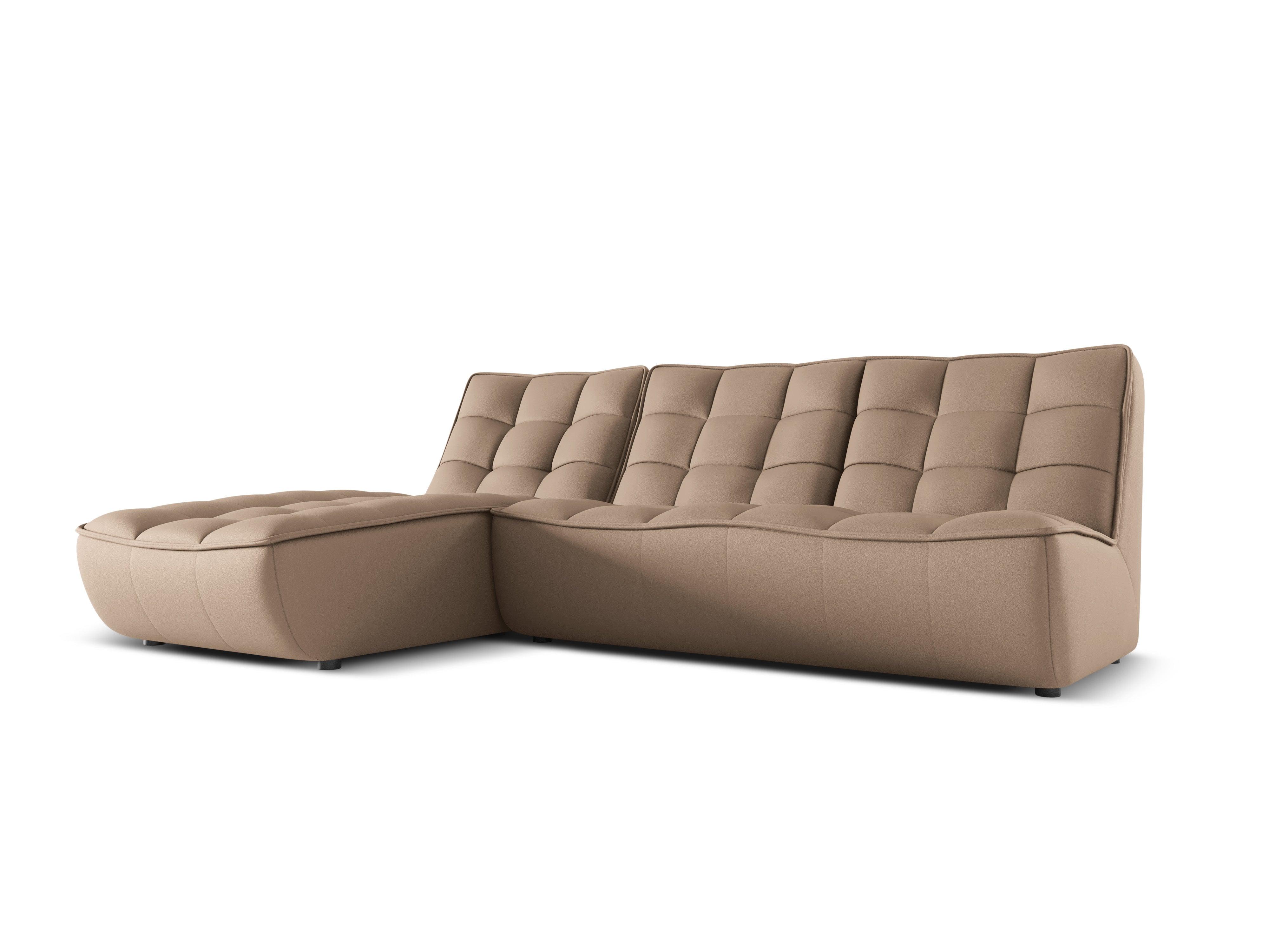Kožený rohový gauč pro čtyři osoby Moni definuje funkčnost a pohodlí v kombinaci s moderním designem. Stylové prošívání a originální tvar skvěle zapadnou jak do elegantního obývacího pokoje, tak do moderní kanceláře. Linia sedáku a opěradla je zakřivená a má jemně profilované prohloubení, které nabízí neobyčejné pohodlí při používání.