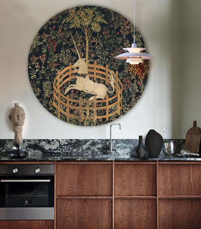Vítejte ve magickém světě s dots - Jednorožec, kulatou nástěnnou malbou zobrazující mytologického jednorožce uprostřed tajemné zahrady. Tato enigmatická dekorace stěny přinese do Vašeho domova kousek fantazie a elegance.