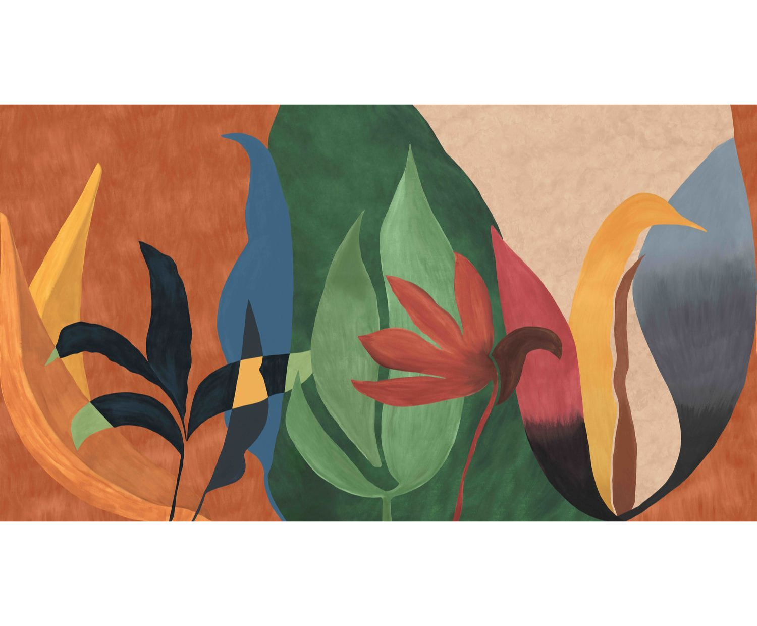 Nástěnná malba s abstraktním rostlinným motivem listů NAHUA hnědočervená se zelenou