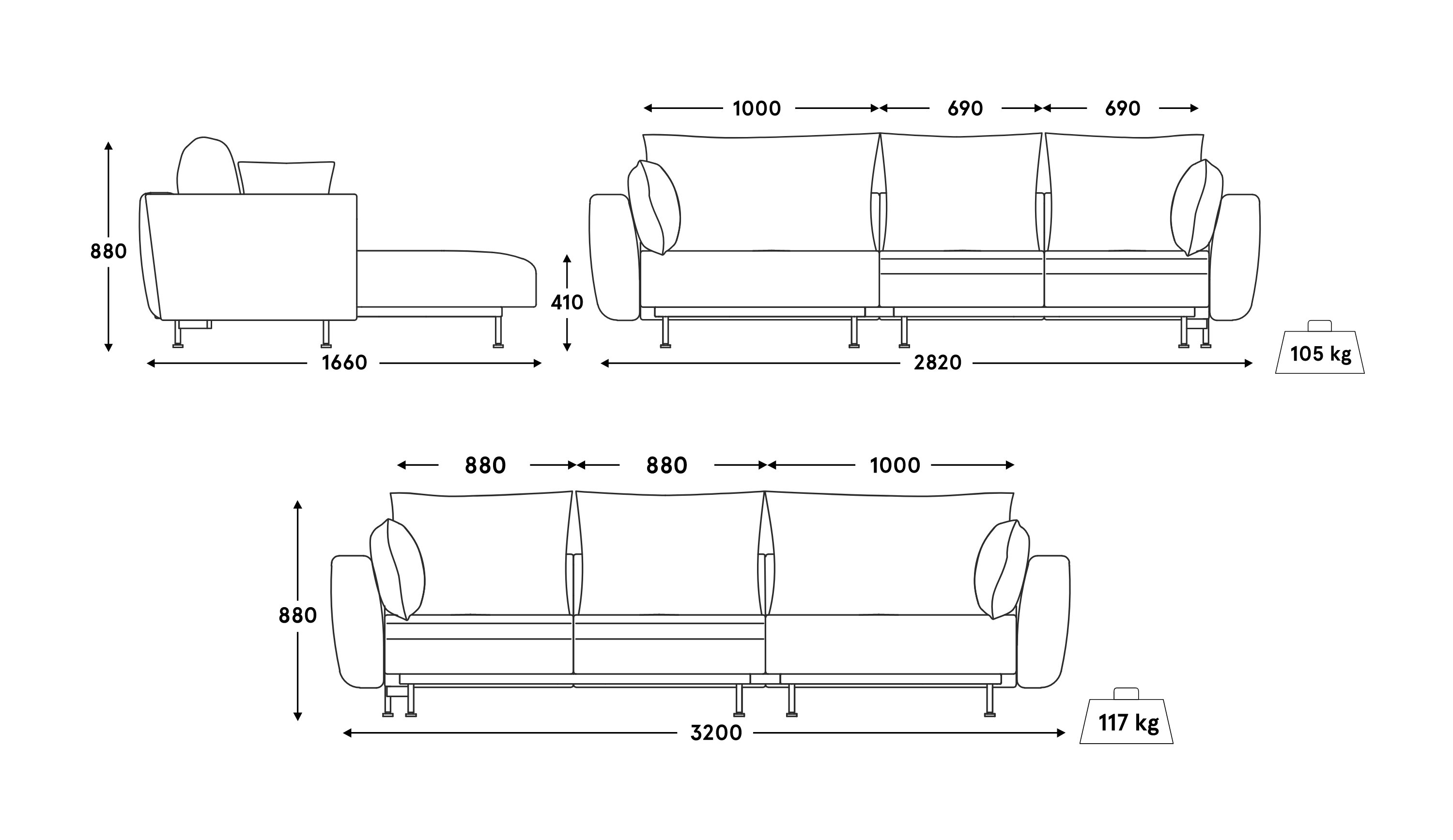 Polštáře vyrobené z kombinace řezané silikonové a polyuretanové pěny zajišťují zároveň měkkost a nadýchanost opěradla, jakož i jeho správný objem a pružnost. Laminování látky zabraňuje jejímu mačkání a deformaci, takže i po dlouhém používání pohovka vypadá jako nová. Kovové nožičky s filcovými podložkami zajišťují stabilizaci sedadla na jakémkoli povrchu a chrání podlahu před poškrábáním.