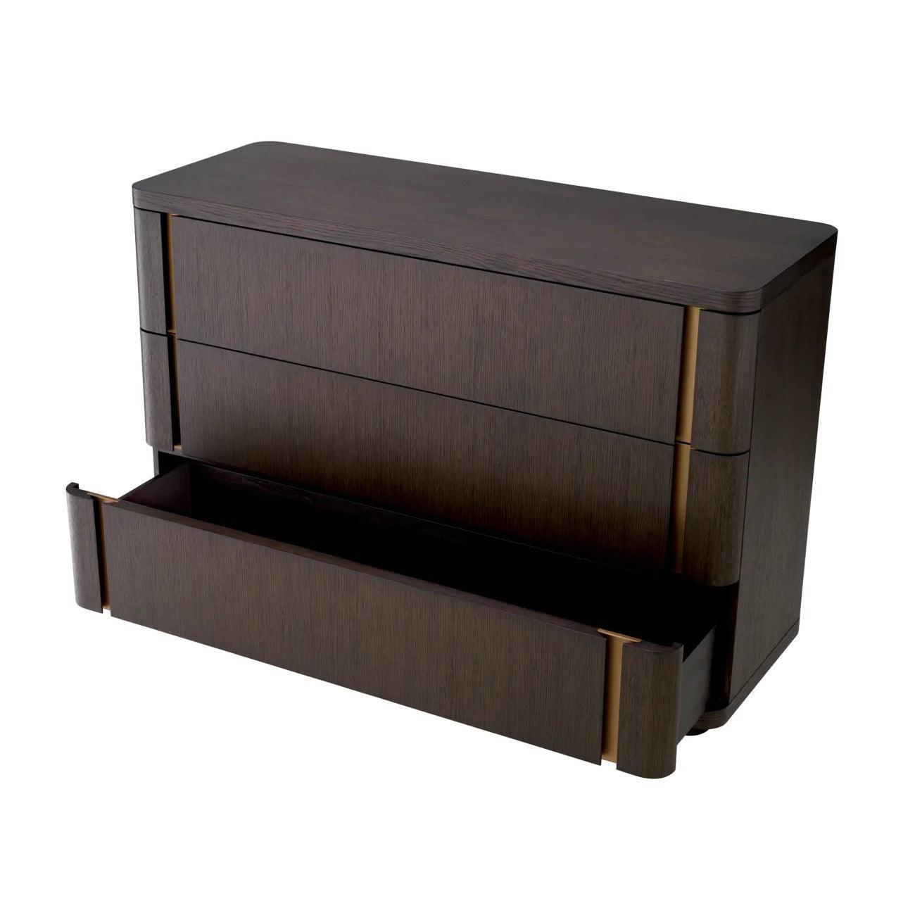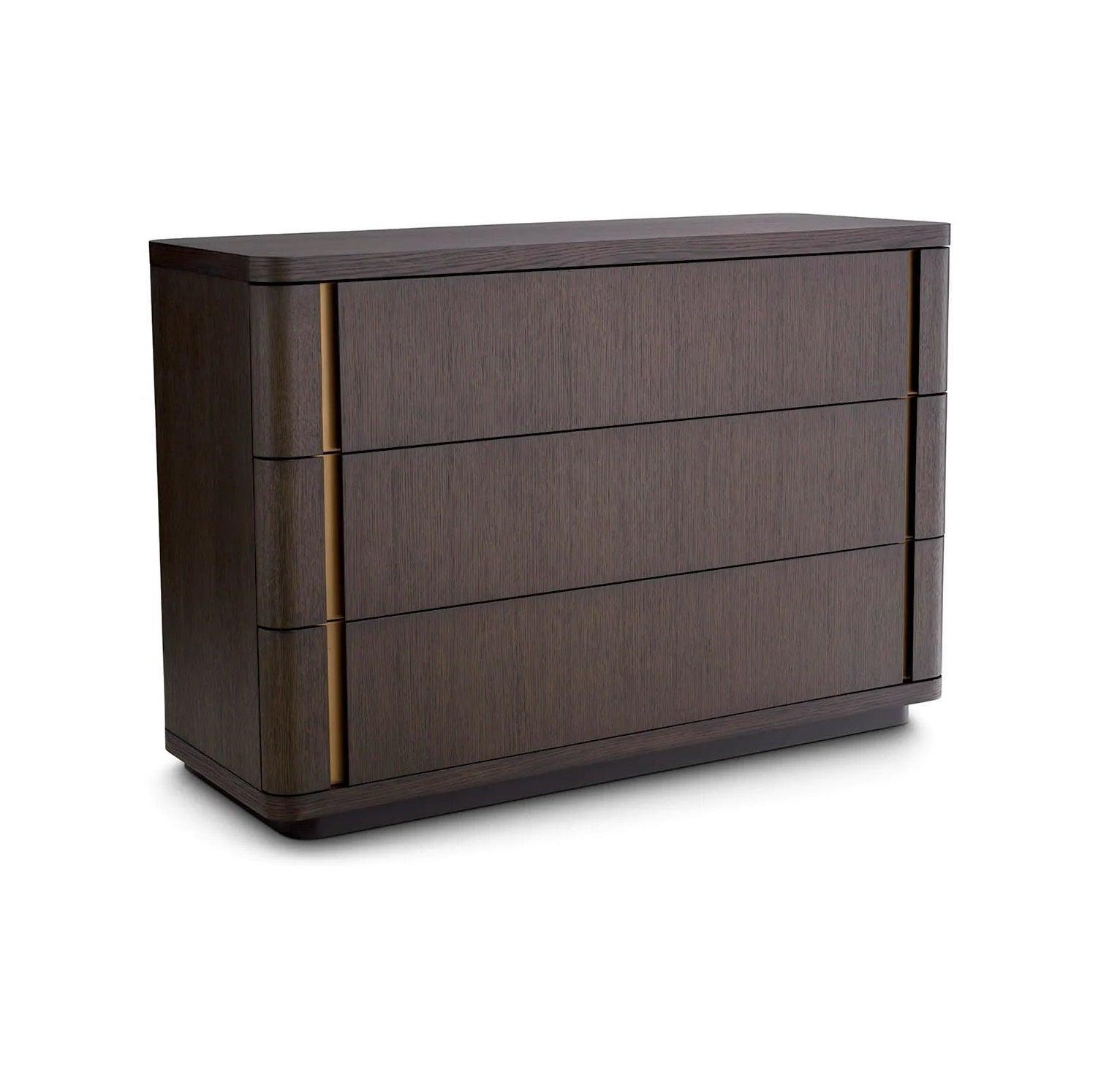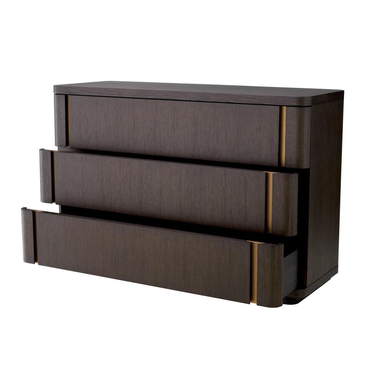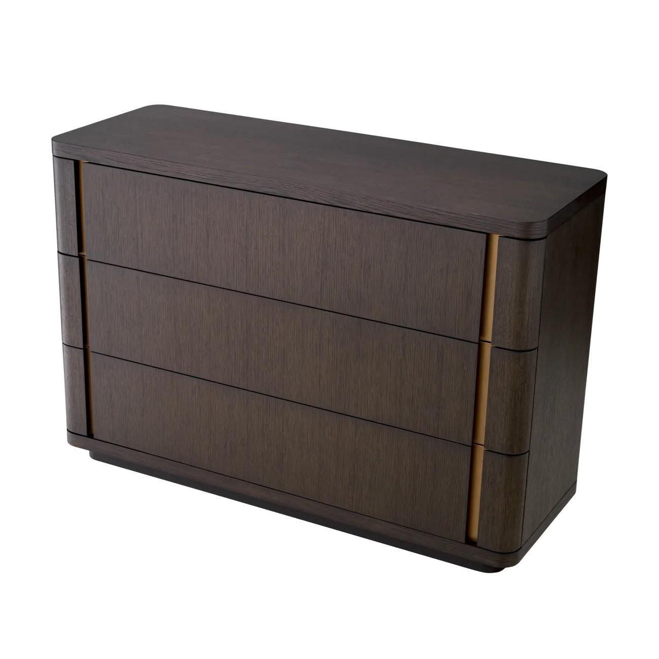 Komoda Modesto to ucieleśnienie doskonałości w detalu, mieszanka klasy i funkcji. Jej eleganckie linie i wyrafinowane wykończenia przemawiają do najbardziej wymagających estetów, zachęcając do przyjrzenia się bliżej jej mistrzowskiej konstrukcji. Czekoladowy odcień w fornirze dębowym przywołuje atmosferę luksusu, a wykończenie szczotkowanego mosiądzu dodaje wyrafinowanego, metalicznego akcentu, nadając całości wytwornego charakteru.
