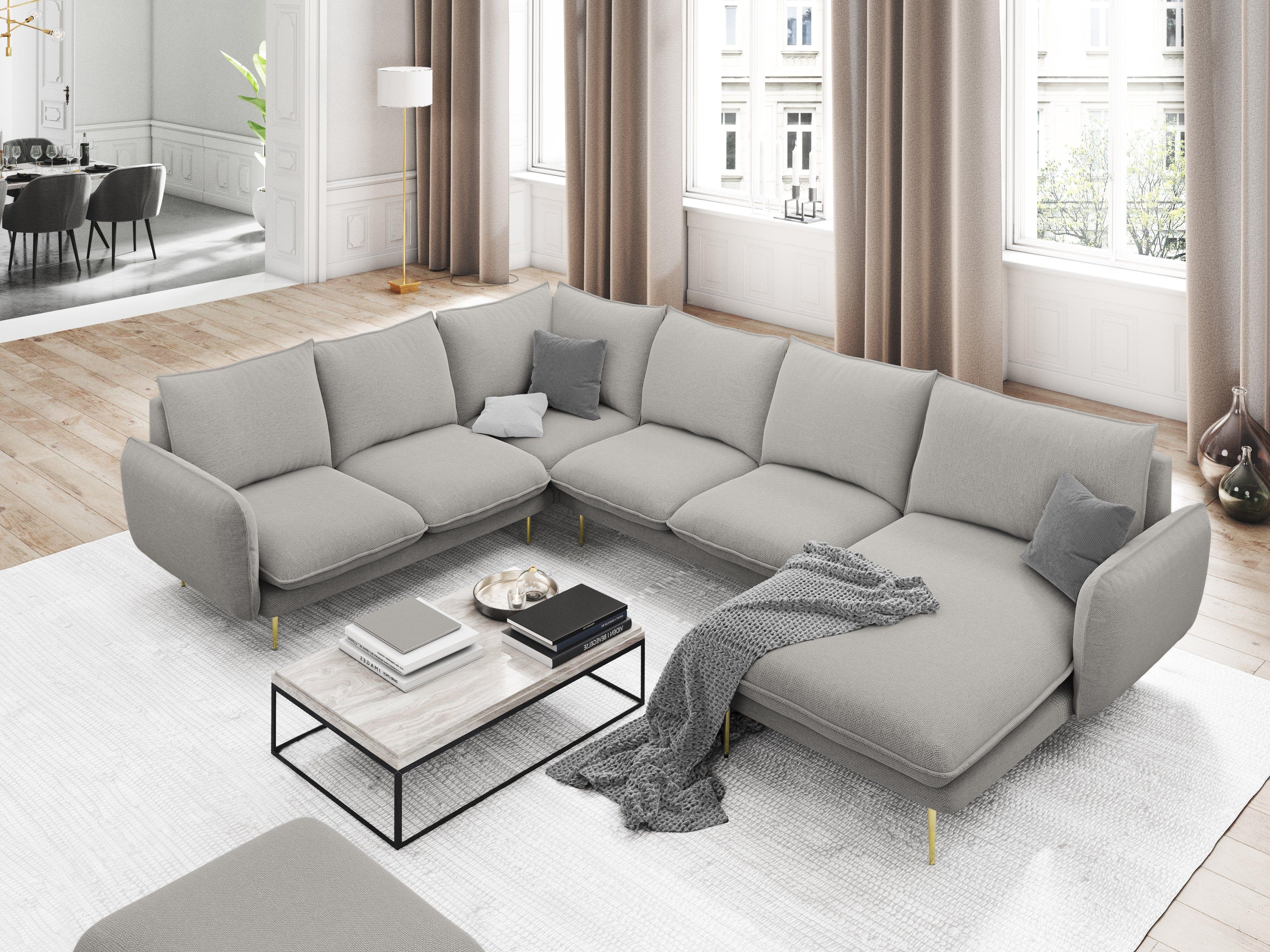 Rohová sedací souprava levostranná pro 7 osob VIENNA světle šedá šenil se zlatým podstavcem