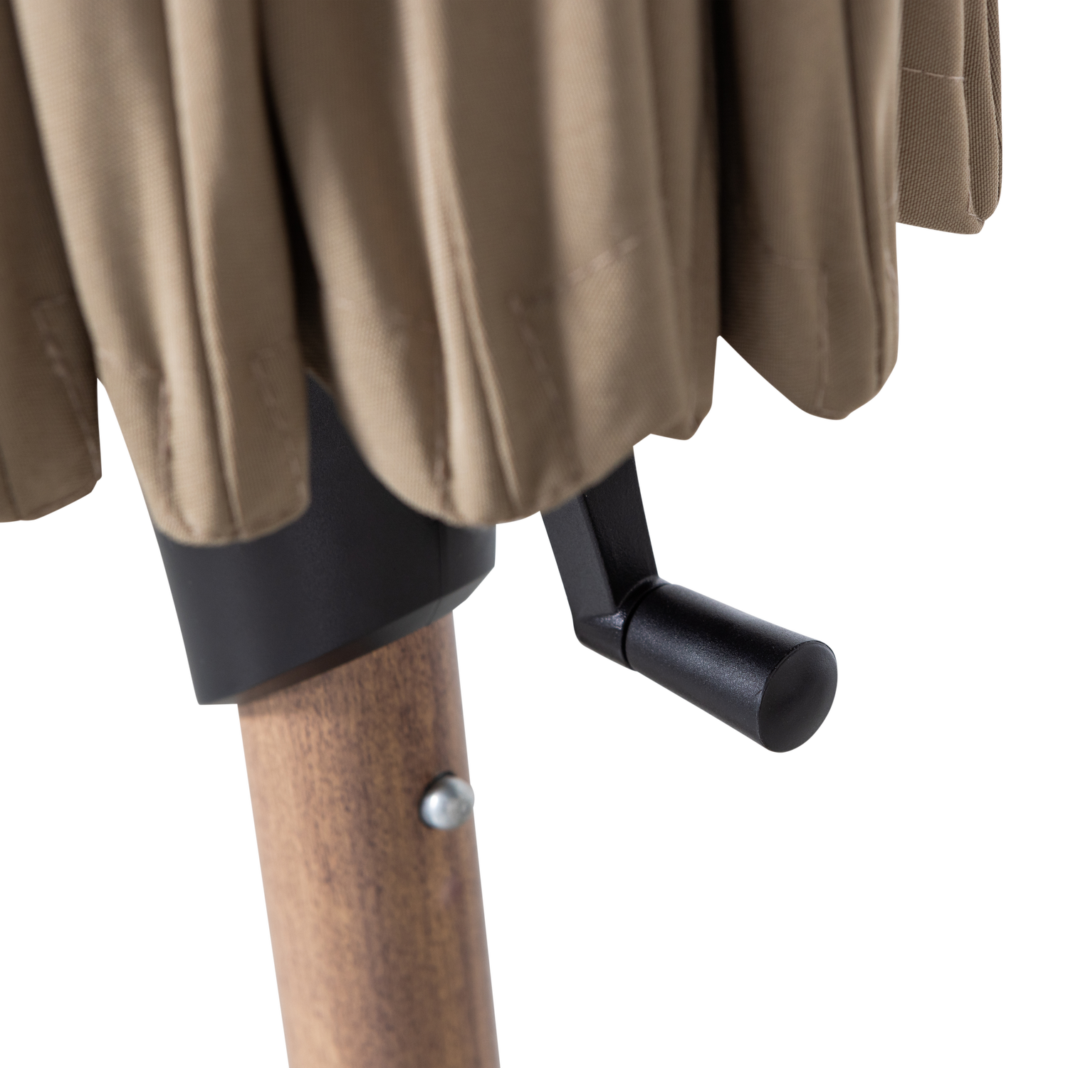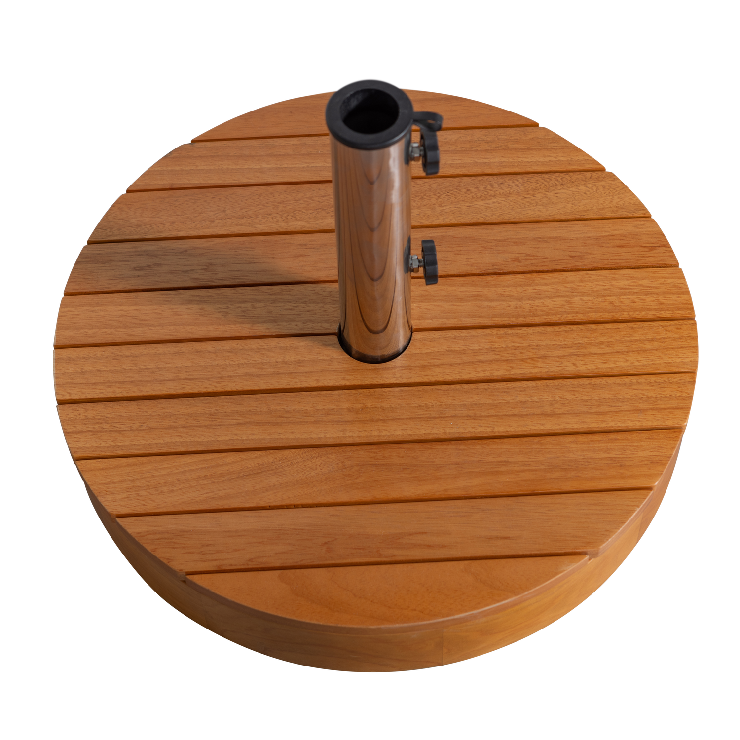 Doplňkem soupravy je robustní podstavec slunečníku, vyrobený z odolného eukalyptového dřeva, který zaručuje stabilitu a dlouhou životnost celé konstrukce. Hliník použitý v rámu je lehký a zároveň odolný vůči korozi, což činí slunečník velmi praktickým pro venkovní použití. Je to funkční a estetický komplet, který díky vysoce kvalitním materiálům poskytuje pohodlnou ochranu před sluncem, přičemž si zachovává elegantní vzhled po mnoho sezón.