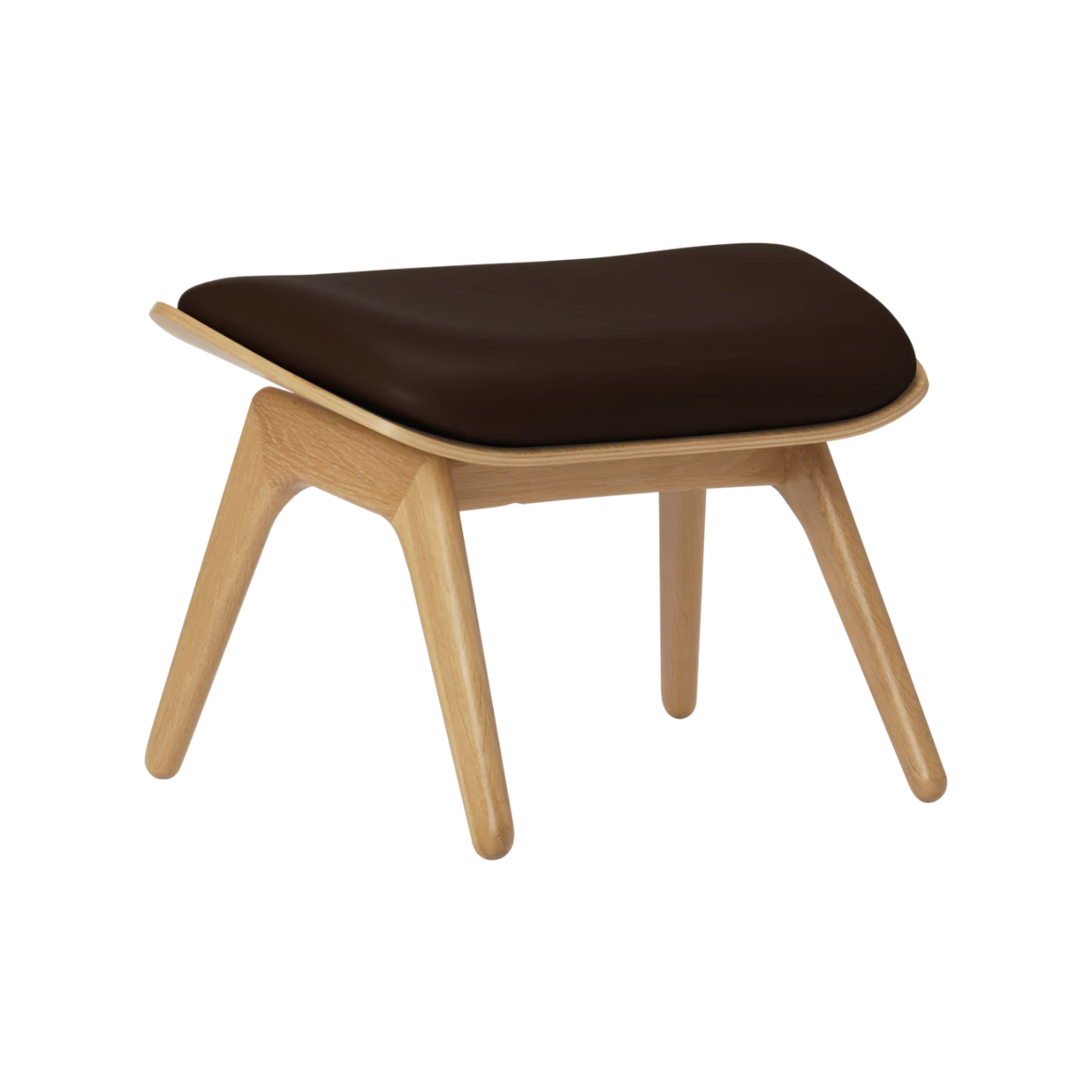 Tvar sedací podušky byl navržen tak, aby lehce odhaloval dřevěnou skořápku podnožky, zdůrazňující elegantní detaily a řemeslné zpracování. Kožené čalounění dodává celku výjimečný charakter a nadčasovou třídu. Matný, na dotek příjemný povrch kůže s přirozenou texturou krásně stárne a časem získává ještě větší kouzlo.
