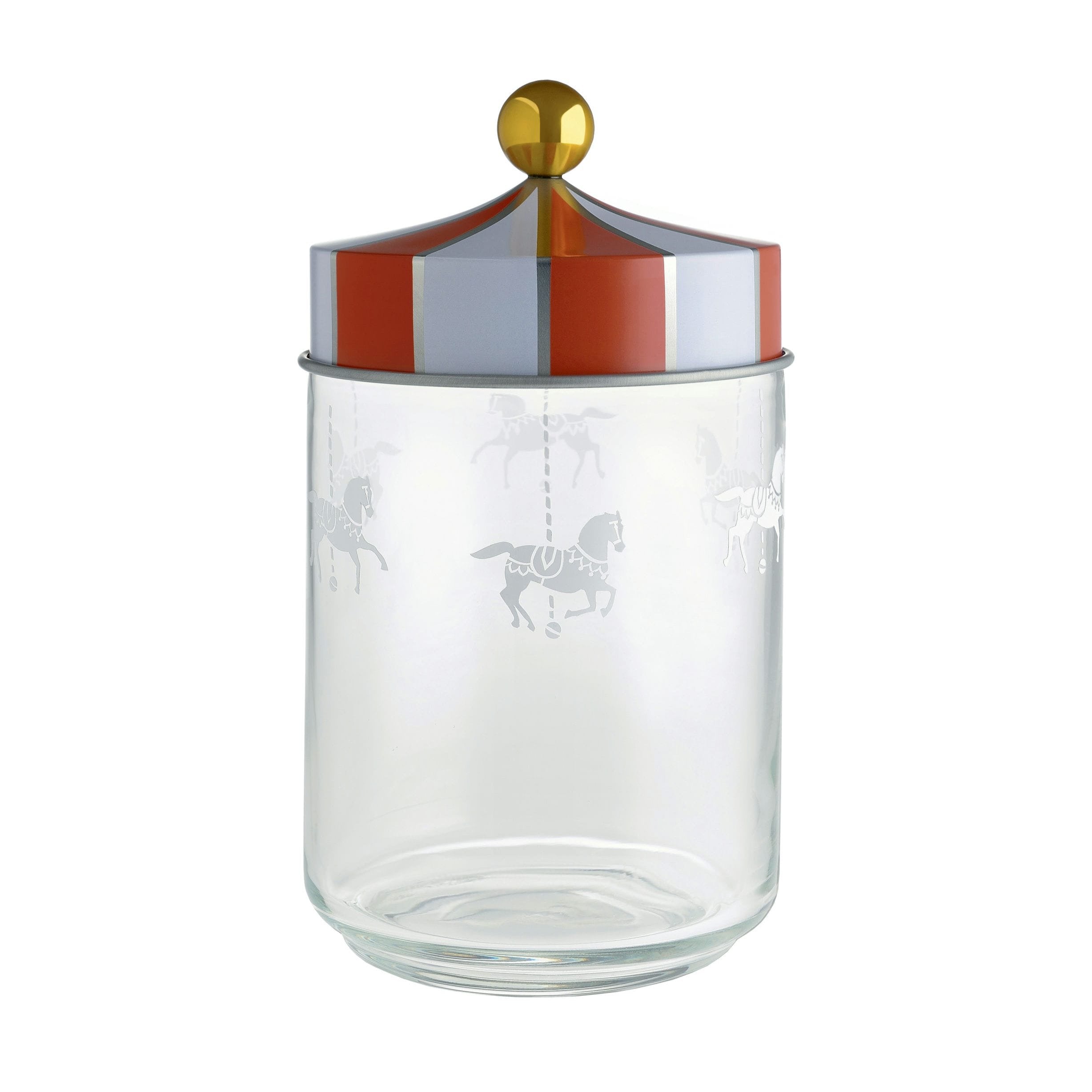 Sklenice ze série Alessi Circus s hermetickými víčky jsou ideálním řešením pro uchovávání různých potravin, přičemž zachovávají jejich čerstvost, aroma a chuť. Marcel Wanders dal těmto předmětům dekoraci inspirovanou kolotoči a zábavními parky, připomínající barevný svět cirkusu. Víčko je zdobeno tradičními červeno-bílými pruhy, které odkazují na markýzy, a zlatá rukojeť dodává celku výjimečný, ozdobný charakter. Výsledek je ohromující: Wanders proměňuje klasické kuchyňské sklenice v radostné, miniaturové kolotoče, které vnášejí do kuchyně atmosféru zábavy a magie.