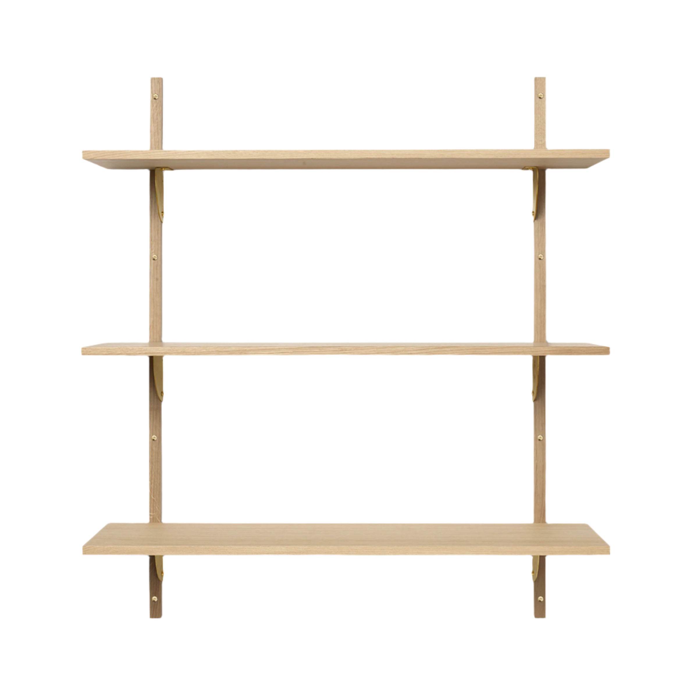 Trojúrovňová polička Sector Triple Wide z přírodního dubu je elegantní a moderní interpretací klasických regálů ve stylu poloviny století. Kombinace přírodního dřeva a mosazných podpěr jí dodává nadčasový charakter, zatímco robustní konstrukce a viditelné montážní prvky přidávají výrazný architektonický styl. Ideální pro vystavení dekorací, knih nebo nádob v obývacím pokoji, kuchyni nebo kanceláři.