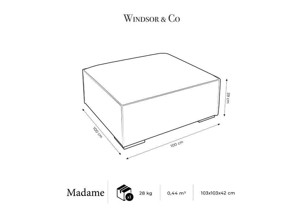 Kožený puf Madame je ideální kombinací elegance a nadčasové formy. Geometrický, poněkud surový tvar skvěle zapadne do interiérů moderní klasiky s nádechem současnosti. Dekorativní prošívání na koženém čalounění dodává celku neobyčejný charakter. Dřevěné nožky z bukového dřeva nejenže krásně vypadají, ale také tvoří pevný základ.