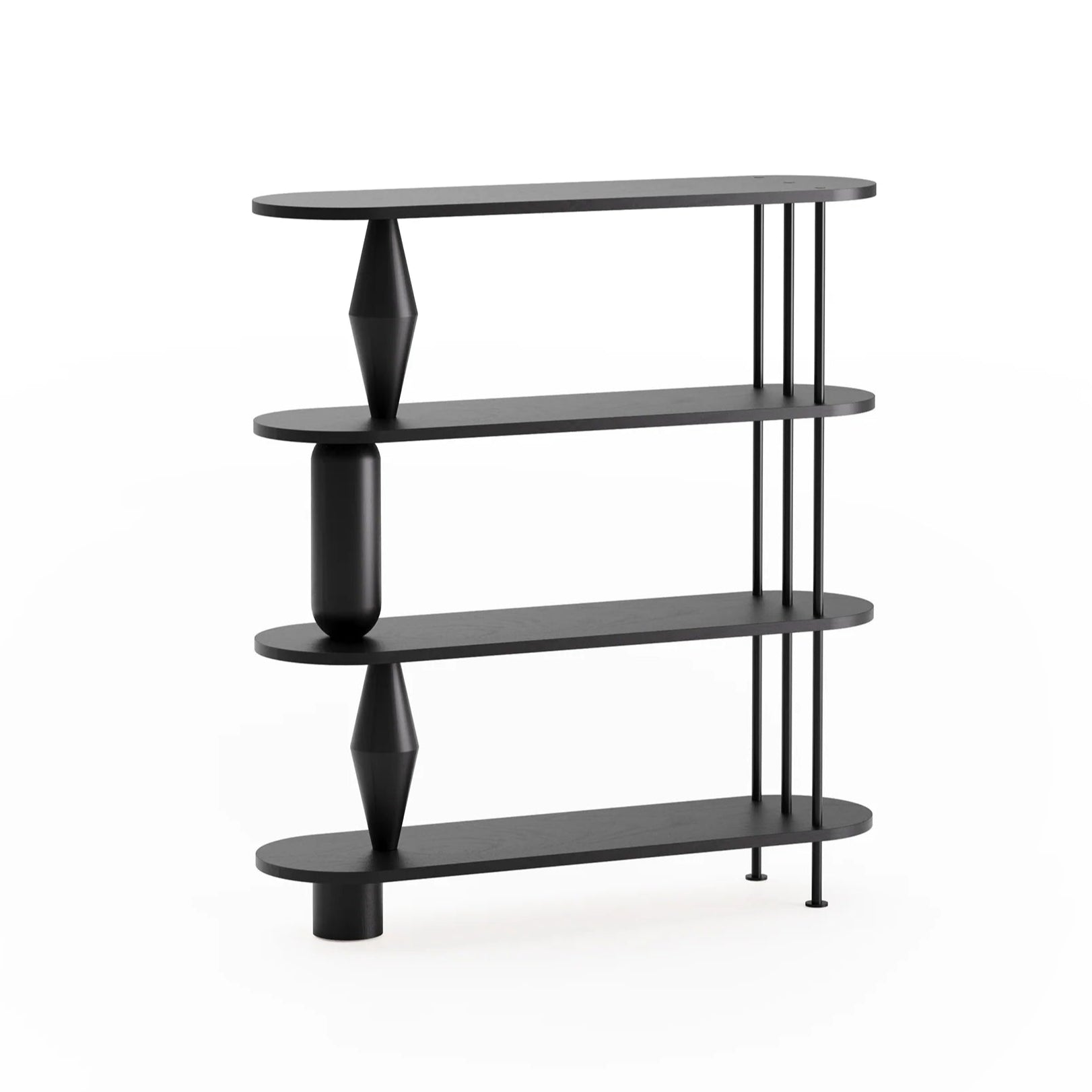 Regál Vazoo Duo je moderní interpretací systému polic, kde se estetika setkává s funkčností. Otočené, sochařské prvky připomínající vázy dodávají nábytku jedinečný charakter a stávají se jeho poznávacím znamením. Díky použití lehkých, prodyšných detailů z práškově lakované oceli si celkový vzhled zachovává vizuální lehkost, což ho činí ideálním jak pro minimalistické, tak pro eklektické interiéry.