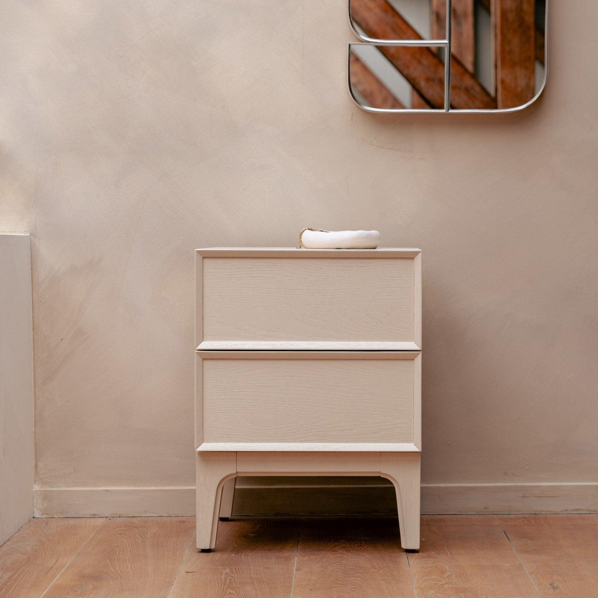 Dvě zásuvky s mechanismem push-to-open činí skříňku nejen okouzlující na pohled, ale také praktickou.
