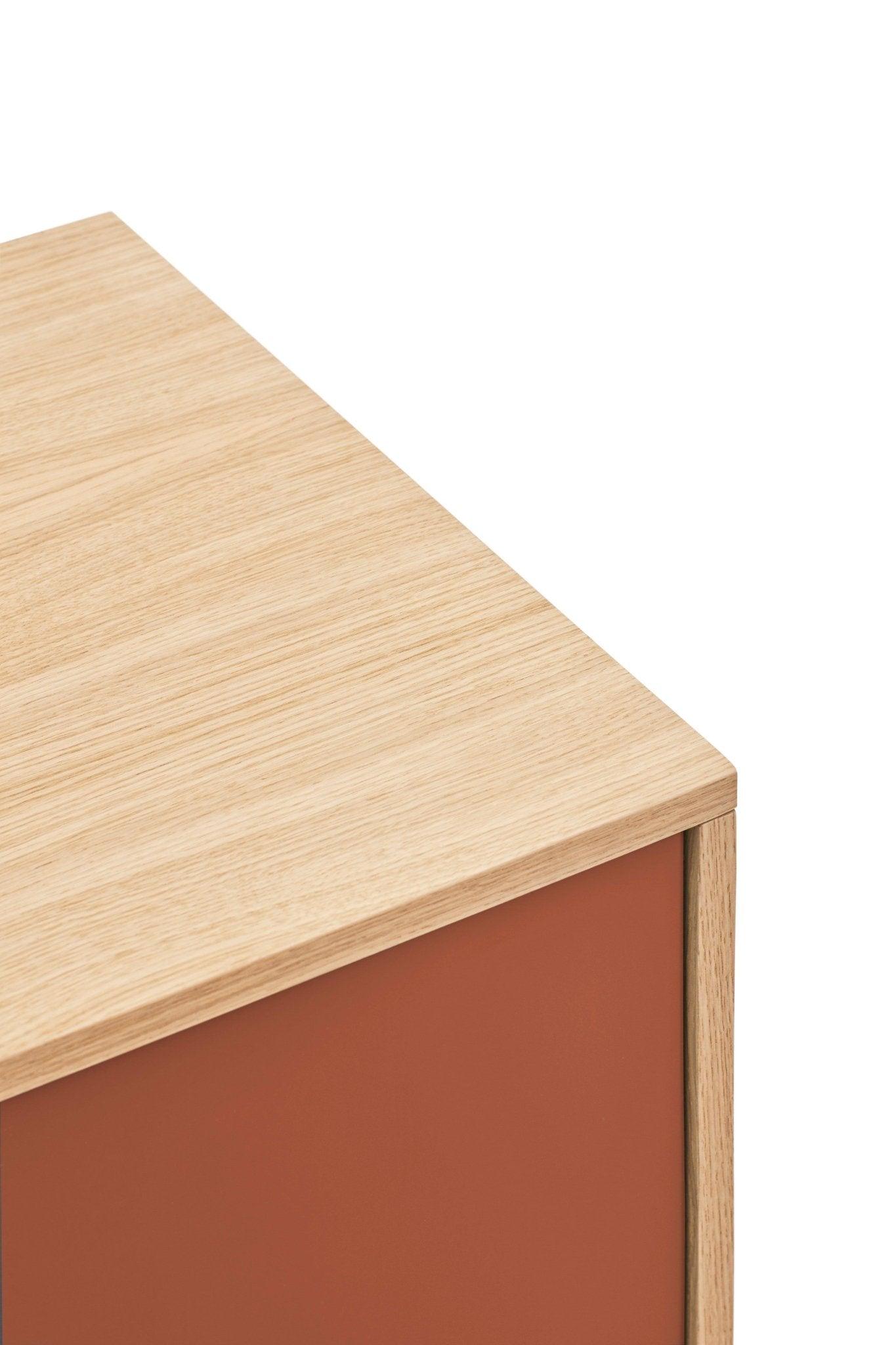 Kombinace zásuvek a skříněk dělá z komody nejen skvělý designový kousek, ale také funkční prvek, který pojme všechny potřebné drobnosti. Spojení přirozené struktury dřeva a charakteristické červené barvy způsobilo, že komoda do obývacího pokoje Yoko přitahuje pozornost a vyniká originálním designem.