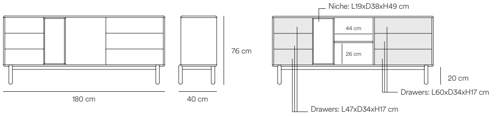 Komoda Corvo, díky prostorným policím a zásuvkám, uspořádaný prostor v obývacím pokoji nebo jídelně. Zajímavý design od Erica Cambrese a Carlosa Garcii také obsahuje jednu vertikální polici bez čela, která umožňuje vystavit předměty jako další dekoraci.