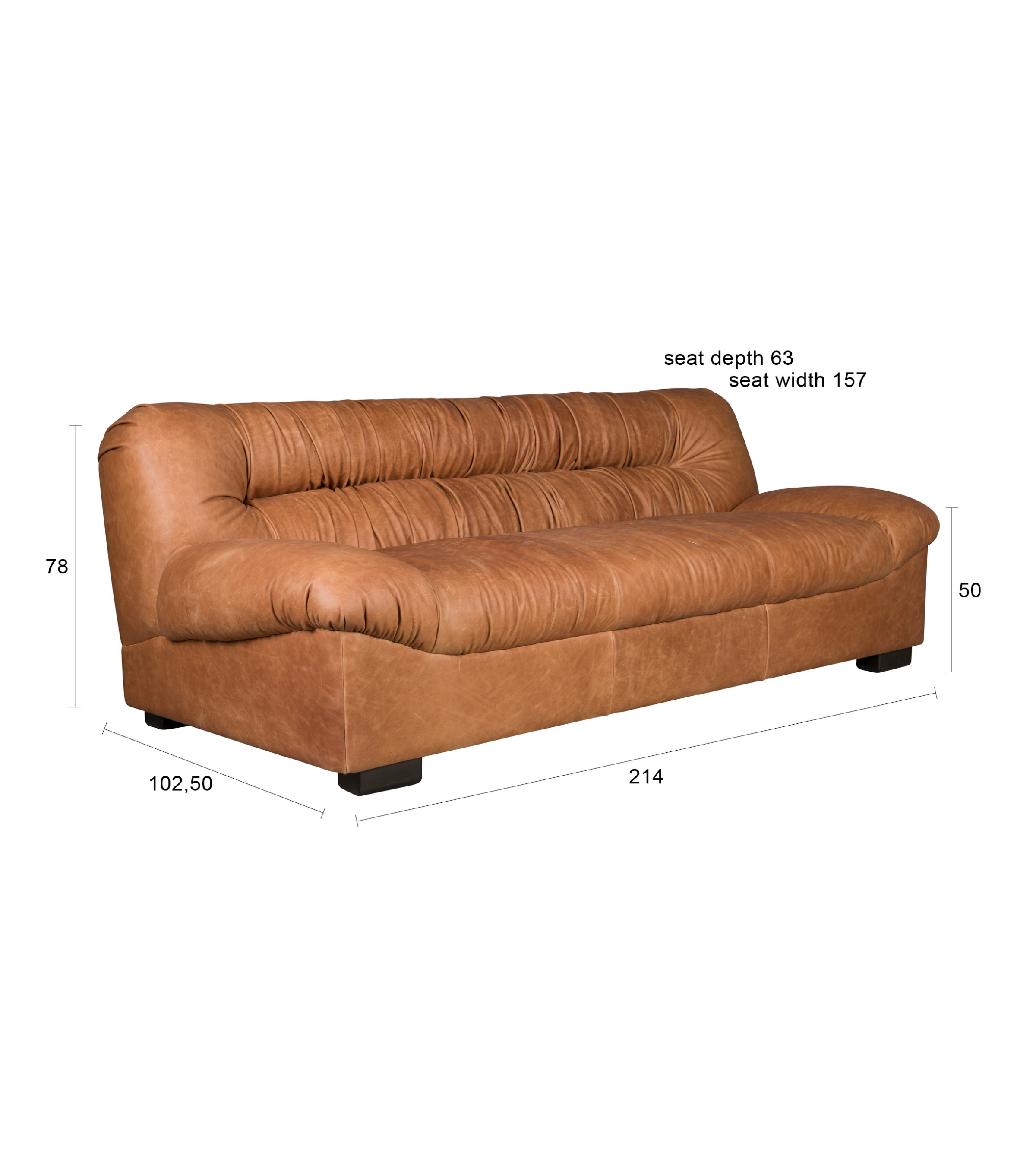 Sofa Douglas není jen pohodlným místem k odpočinku, ale také skutečnou ozdobou každého interiéru. Její měkké, bohatě čalouněné opěradlo s dekorativními plisovanými detaily a horizontálním prošíváním přitahuje pozornost, zatímco zaoblený tvar a čalounění z přírodní kůže v světlém hnědém odstínu odkazují na estetiku Mid Century Modern. Je to ideální volba pro ty, kteří si cení komfortu a nadčasového designu.