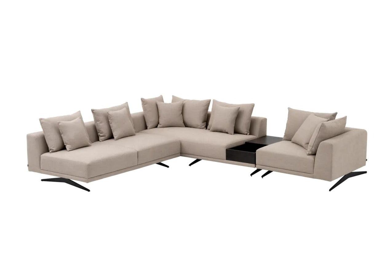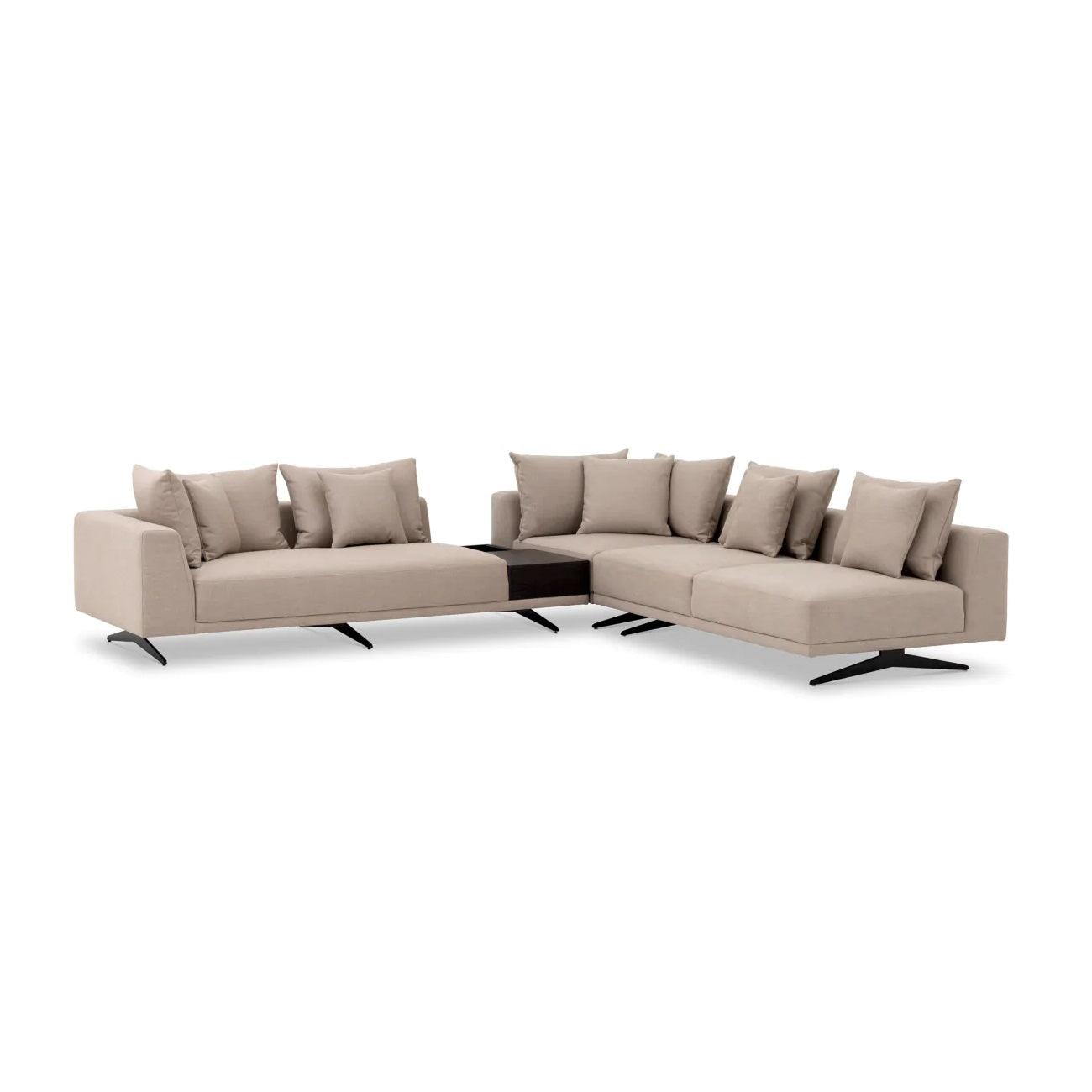 Rohová pohovka Endless je nábytek, který nabízí spoustu možností konfigurace díky svému vestavěnému bočnímu stolku. Tento nesmírně stylový, pískový roh se vyznačuje pevnými, černými nohami a výraznou potahovou látkou, která dodává interiéru elegantní charakter.