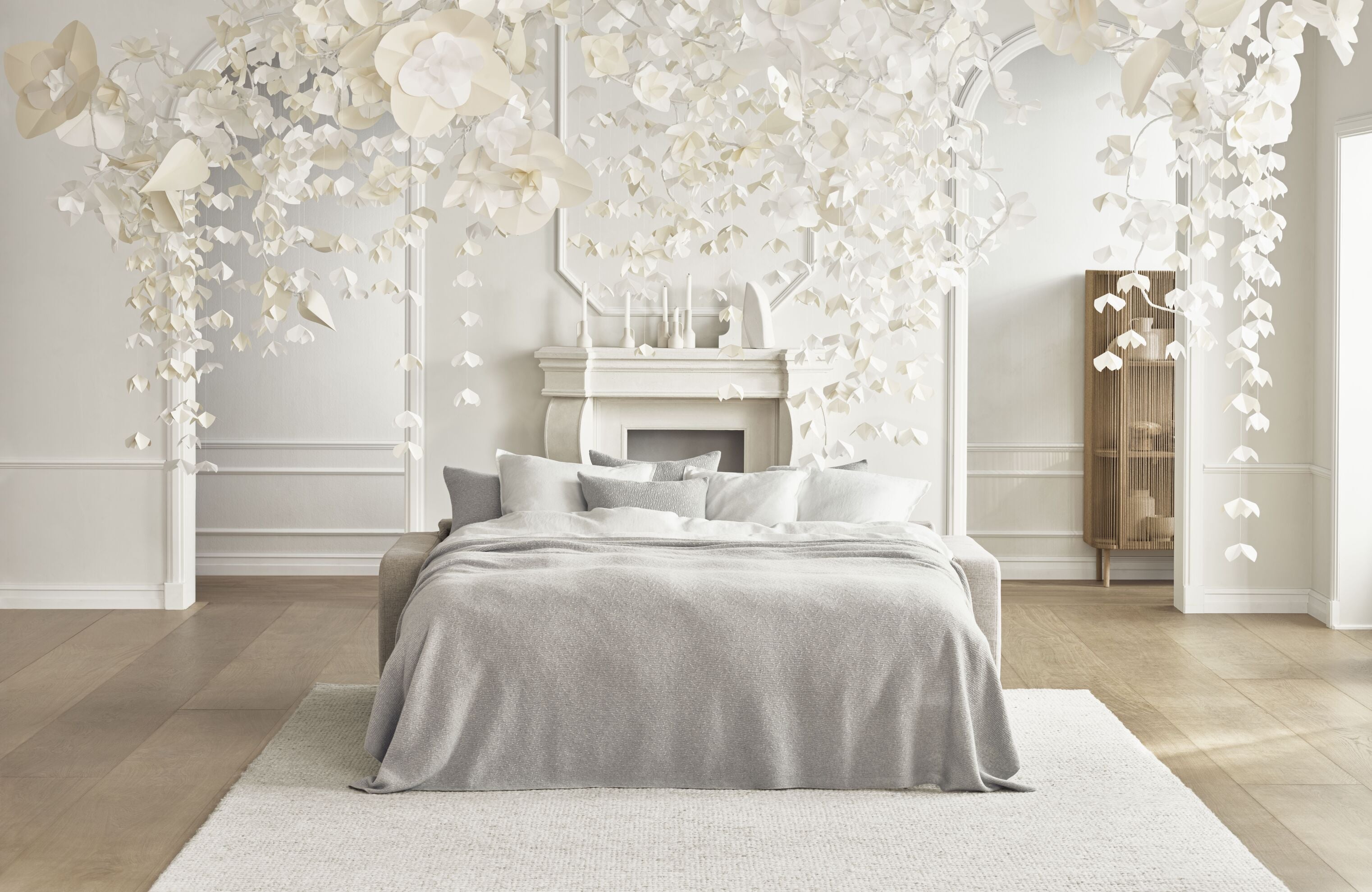 Konstrukce interiéru je vyrobena ze dřeva s certifikací FSC®, což zaručuje trvanlivost a udržitelné přístupy k výrobě. Mechanismus rozkládání patří mezi nejlepší na trhu, zajišťující snadnost používání a spolehlivost. Rohová pohovka je k dispozici s hladce tkanou potahovou látkou s trvanlivou strukturou, která harmonicky zapadá do každého prostoru, zdůrazňující jemné linie a tvary nábytku.