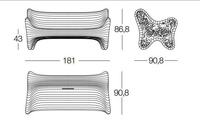 Organický tvar pohovky připomíná formy nalezené v přírodě — měkké, plynulé linie se spojují se solidností masivní hmoty. Díky odolnosti vůči povětrnostním podmínkám pohovka skvěle funguje v exteriérech: na terase, patio, v zahradě nebo ve veřejném prostoru. Projekt spojuje estetiku s odpovědným přístupem k materiálům a životnímu prostředí.