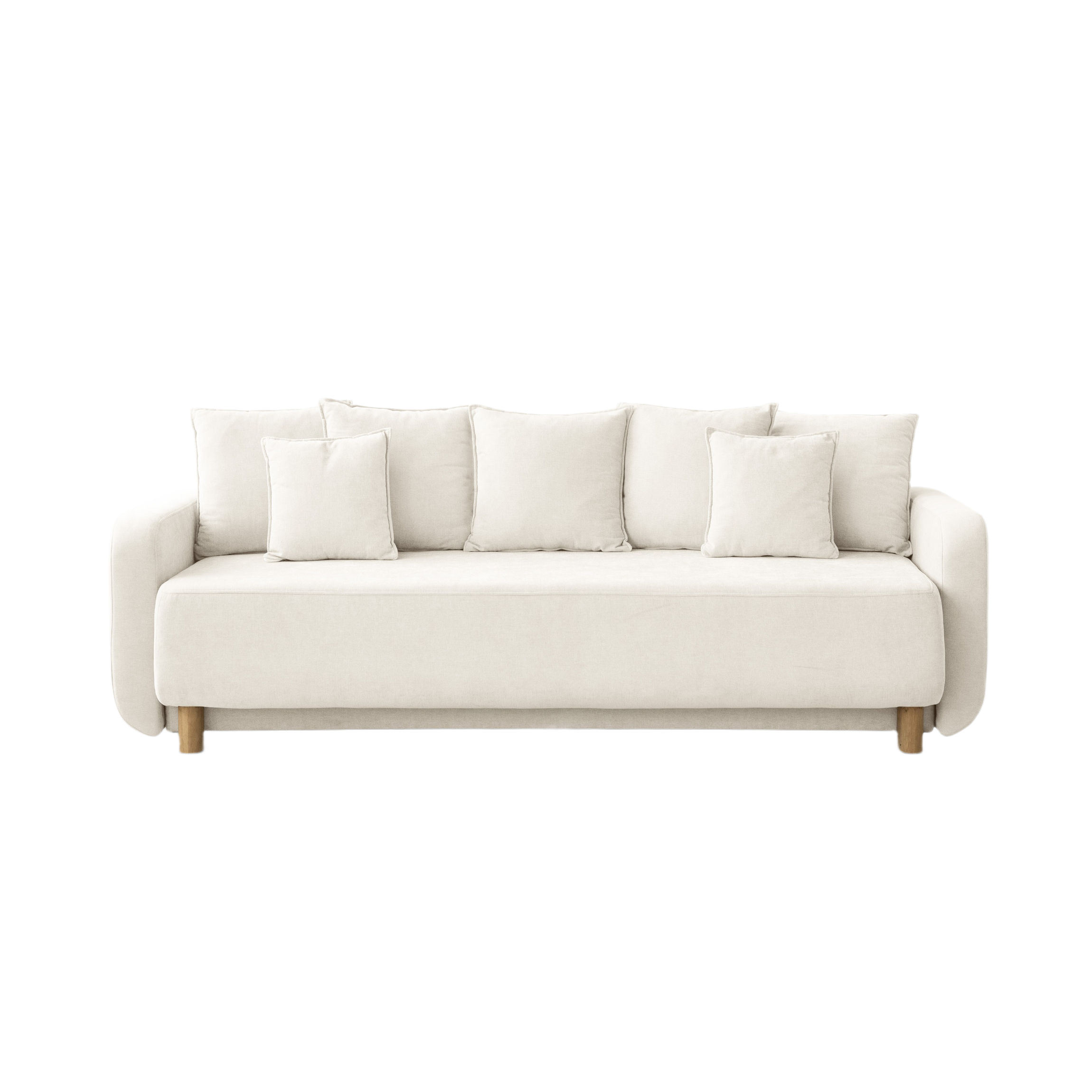 Model Elen okouzluje nejen vzhledem, ale i praktičností. Úložný prostor pod sedadlem je ideálním místem na ložní prádlo nebo jiné domácí doplňky, a souprava pěti velkých opěrných polštářů a dvou menších dekorativních polštářů zajišťuje pohodlí a útulný charakter. Jednoduché opěrky a dřevěné, válcové nohy dodávají celé konstrukci lehkost, činící pohovku Elen elegantním a univerzálním prvkem každého obývacího pokoje.
