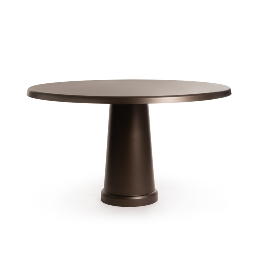 Stół All-Round to nowoczesna propozycja o wyrazistej, rzeźbiarskiej sylwetce. Jednolicie wykonany z tłoczonej blachy stalowej, malowanej proszkowo, przyciąga uwagę swoją prostą, ale monumentalną formą. Szeroka kolumna podstawy harmonijnie przechodzi w okrągły blat, tworząc spójną, graficzną całość.