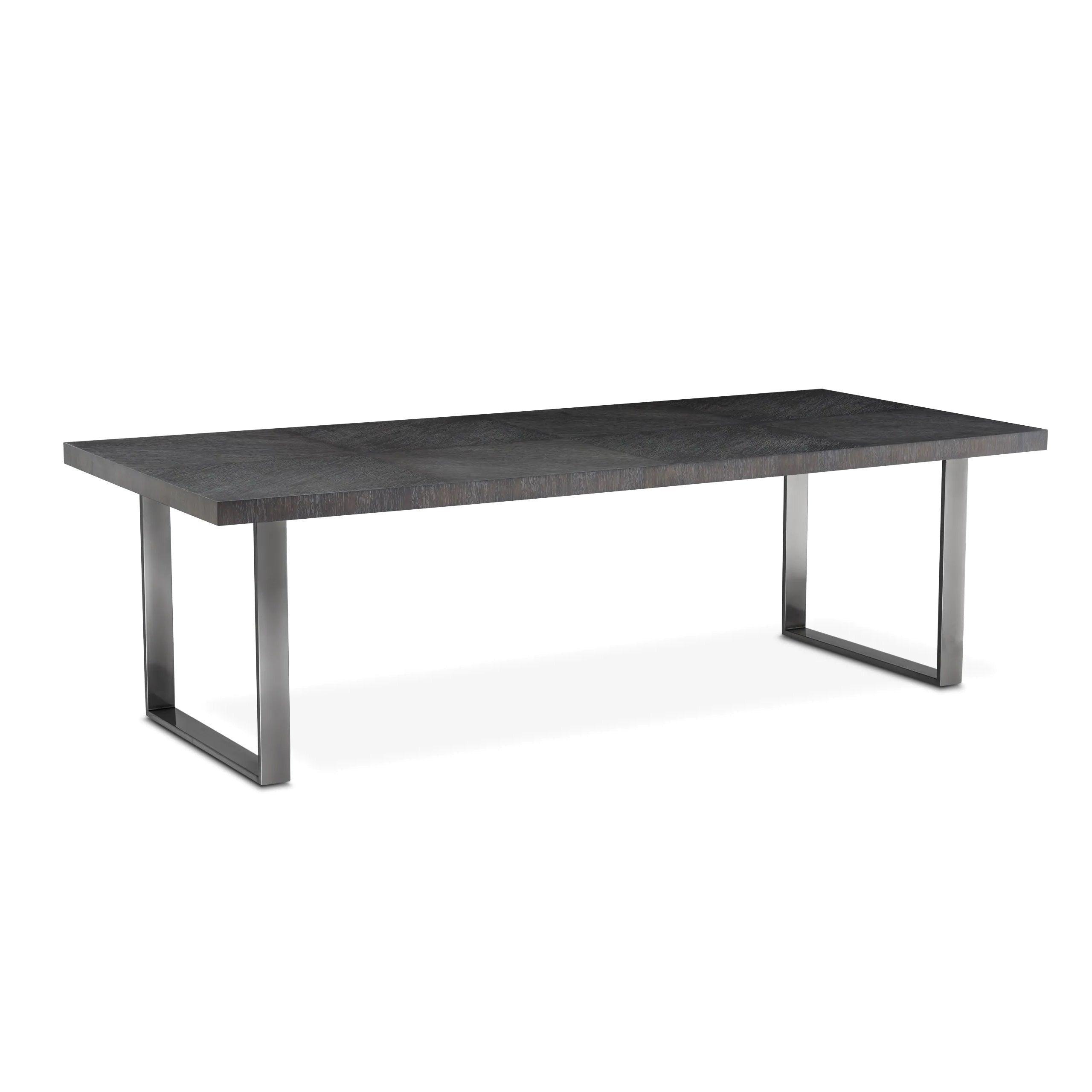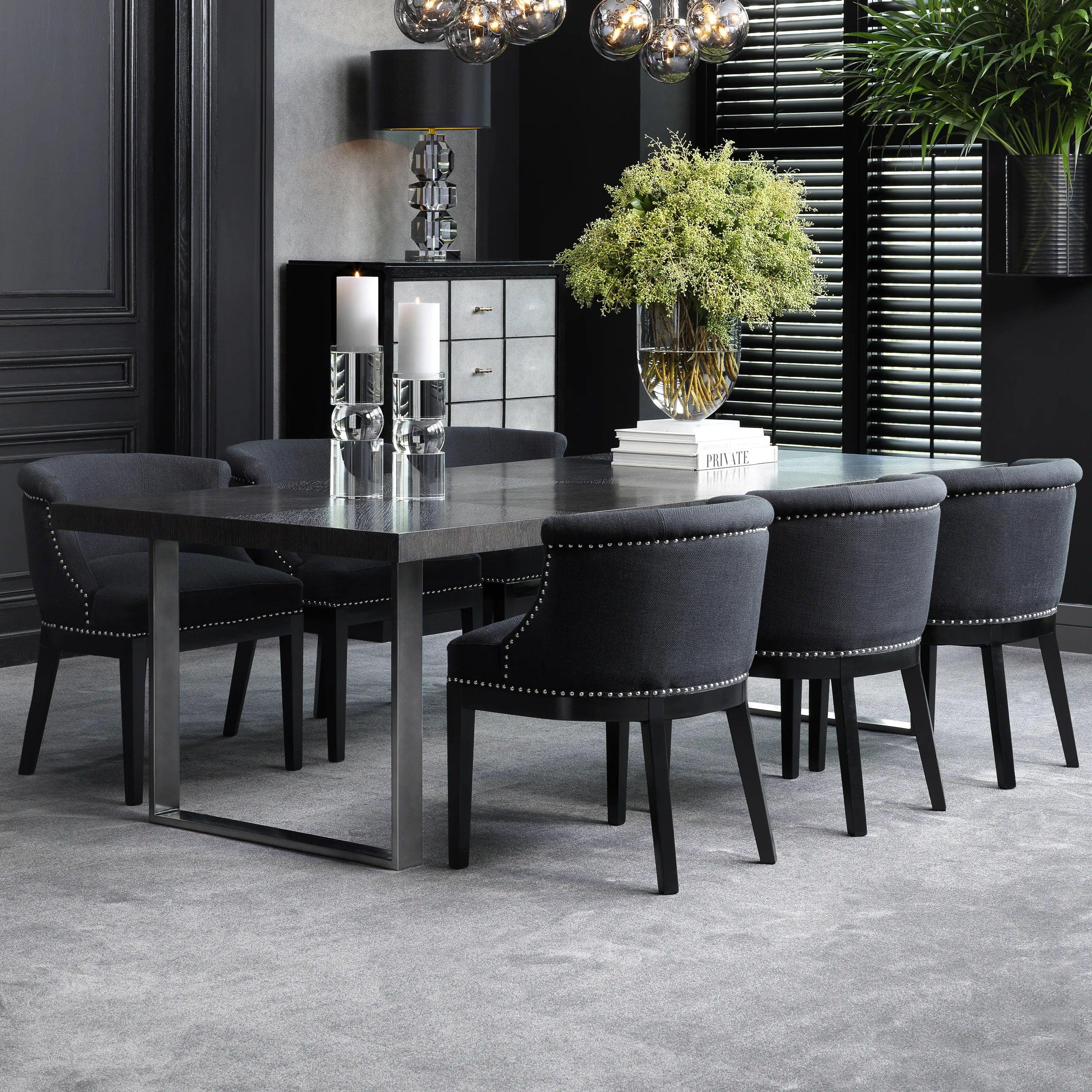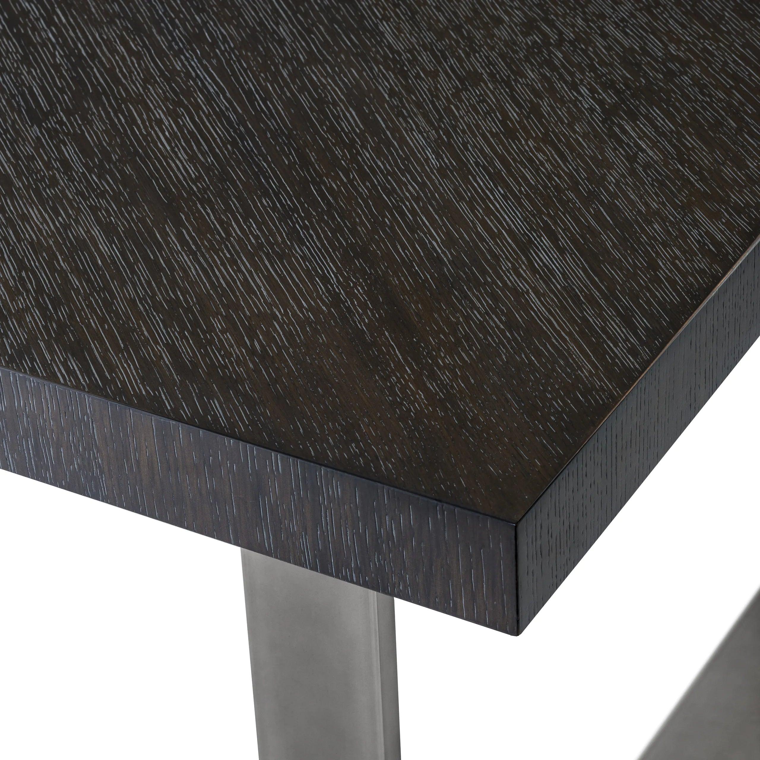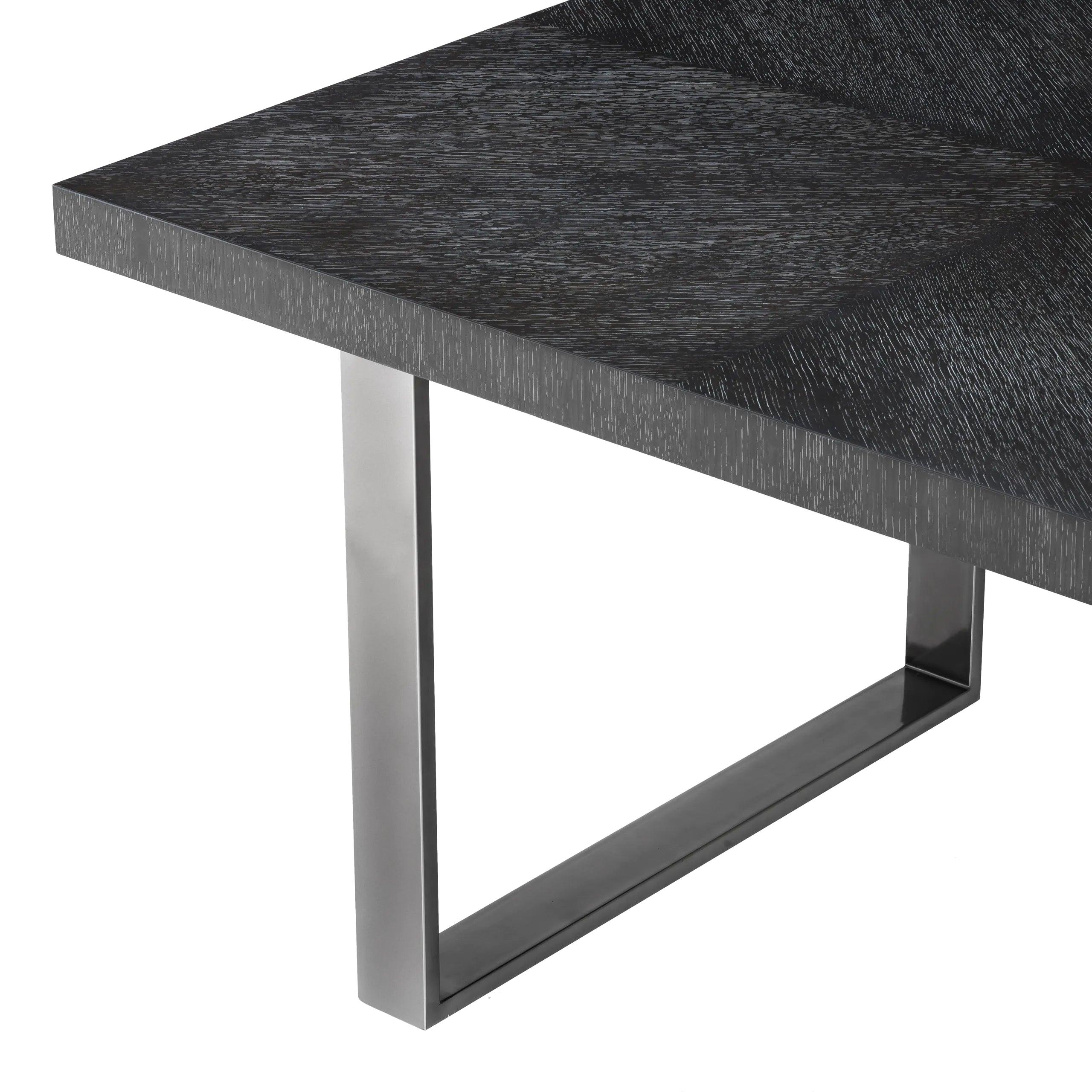 Jakmile vstoupíte do místnosti, vaše oči okamžitě upoutá kovový rám s černým niklovým povrchem. Jeho minimalistická, a přitom výrazná konstrukce vytváří dokonalé pozadí pro desku z grafitového dubového dýhy. Tmavá barva dubu dodává stolu charakter, zatímco zdůrazňuje jeho surovou estetiku.