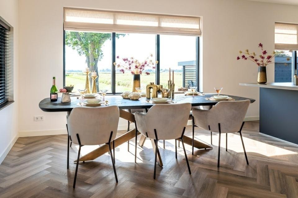 Jídelní stůl Hayley se vyznačuje především svým elegantním vzhledem. Deska stolu je zdobena krásným dubovým dýhováním, pocházejícím z recyklace, které bylo uspořádáno do elegantního vzoru módní rybí kosti. Celkový vzhled byl dokončen v módním černém odstínu, což nábytku dodává moderní charakter.