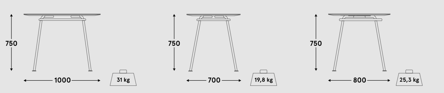 Deska o výšce 750 mm je vyrobena z snadno udržovatelného MDF, pokrytého linoleem. Lakované okraje jsou barevně sladěny se základnou, což podtrhuje moderní charakter designu. Stůl je k dispozici v pečlivě vybraném spektru intenzivních barev, což z něj činí ideální řešení pro kancelářské, hotelové a gastronomické interiéry.