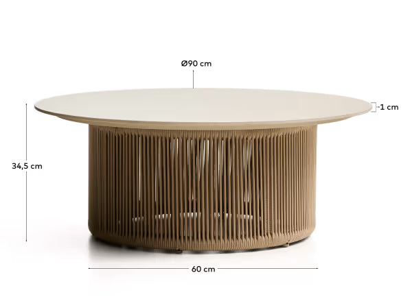 Konferenční stolek Orosei spojuje moderní design s funkčností, čímž vytváří dokonalý prvek do prostor jak vnitřních, tak venkovních. Vyrobený z hliníku a keramické desky, vyznačuje se minimalistickým, skandinávským stylem, který se hodí do různorodých aranžací. Ručně pletený základ z lana v barvě ecru dodává stolku teplo a jedinečný charakter, a zároveň zajišťuje odolnost vůči povětrnostním podmínkám. Díky úpravě materiálu je pletenina odolná vůči UV záření, což zaručuje její dlouhověkost a zachování estetiky po dlouhou dobu.