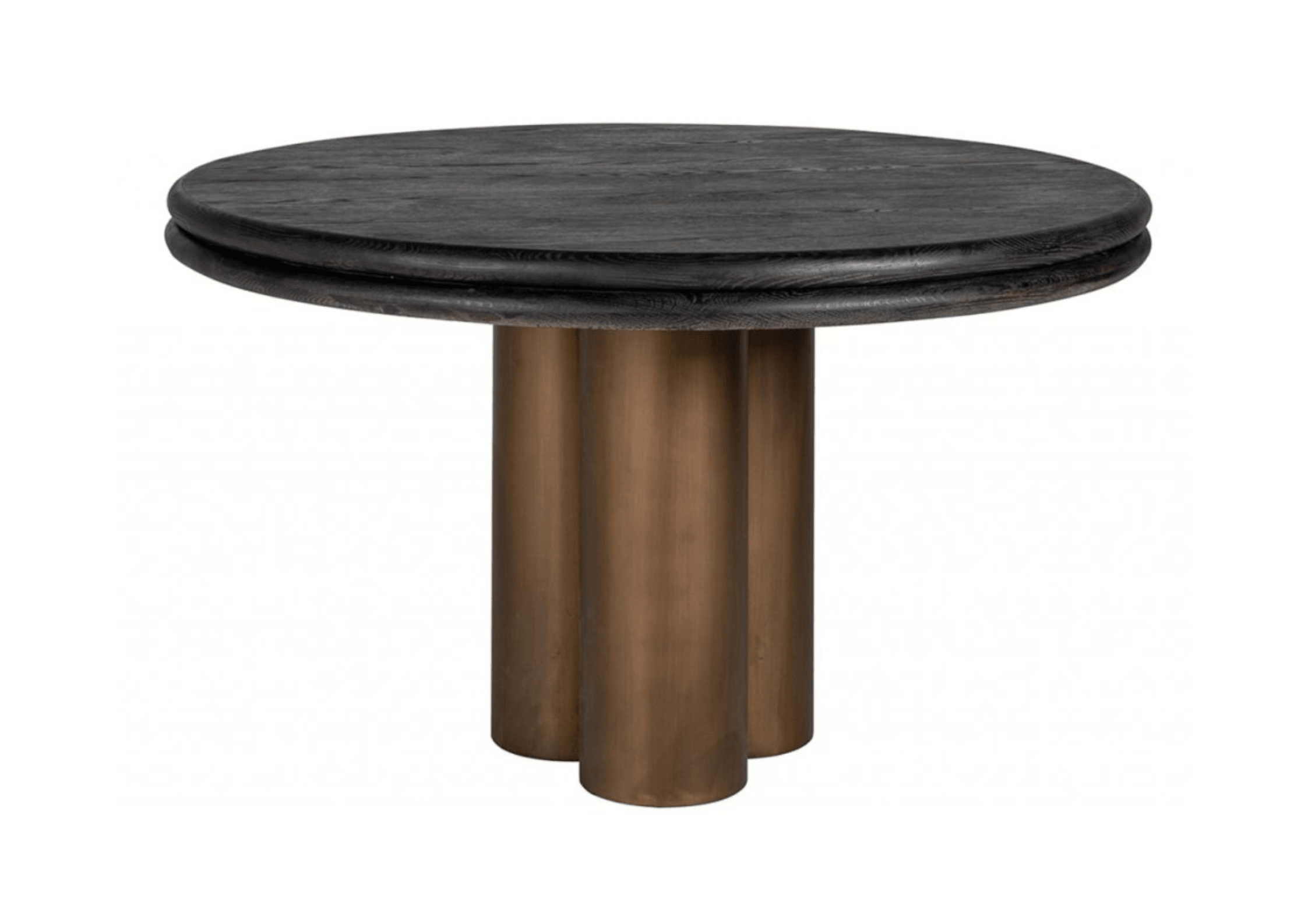 Jídelní stůl kulatý Macaron v odstínech tmavého bronzu a mosazi je vynikající volbou pro ty, kteří si cení výjimečného designu a elegance. Tento výjimečný stůl byl vytvořen z kovu v barvě patinované mosazi a tmavě hnědého povrchu. Deska stolu je ozdobena krásným dubovým dřevem, což vytváří harmonickou a působivou kompozici.