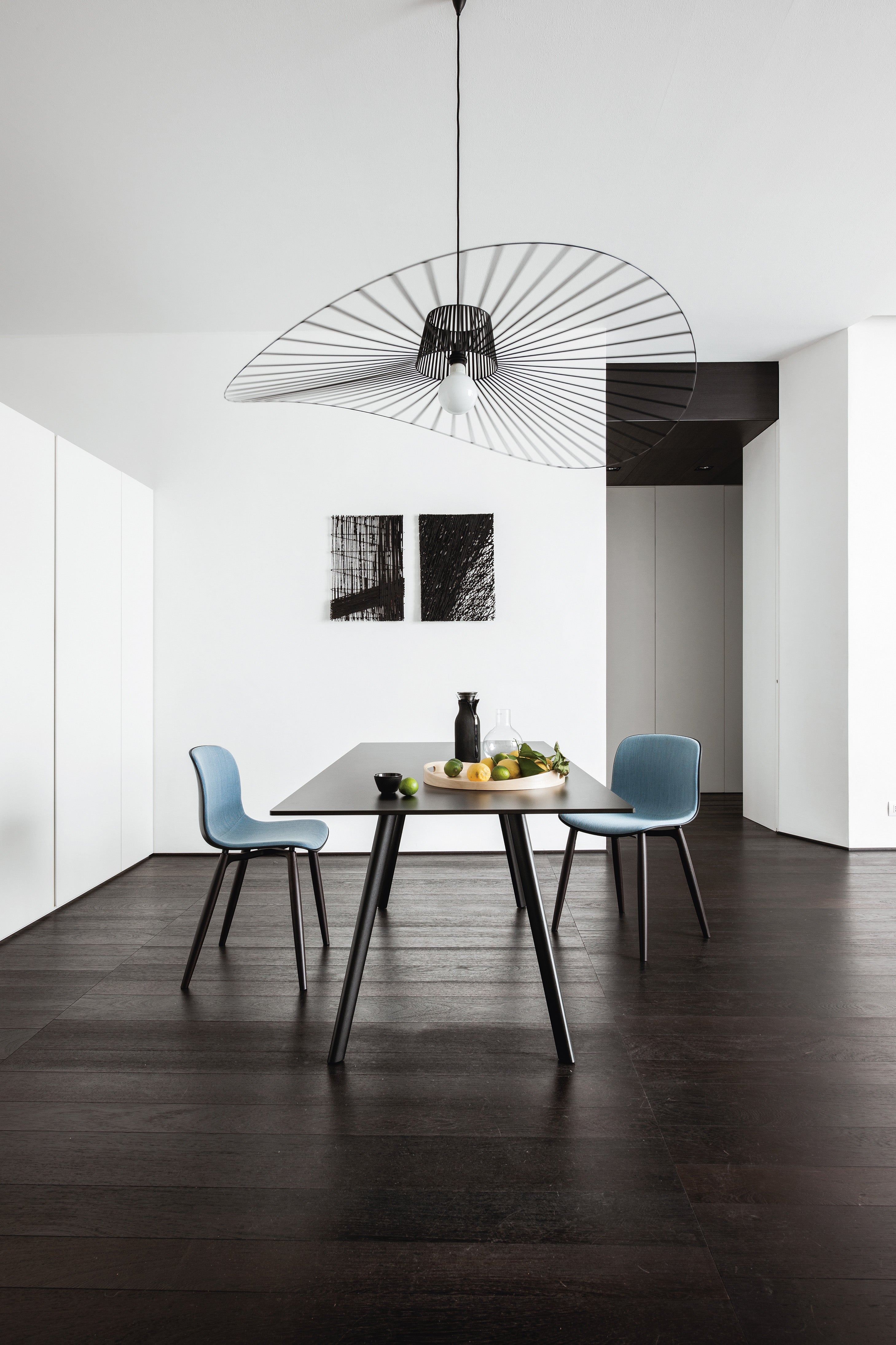 Stół Pilo to wyraz minimalistycznej elegancji i doskonałego rzemiosła, zaprojektowany przez duet Ronan & Erwan Bouroullec. Jego konstrukcja opiera się na solidnych nogach z drewna jesionowego oraz stalowych wspornikach, które łączą się poprzez subtelnie zaprojektowane łączenia z odlewanego aluminium. Elementy te malowane są proszkowo na kolor czarny, nadając całości nowoczesny, graficzny charakter.